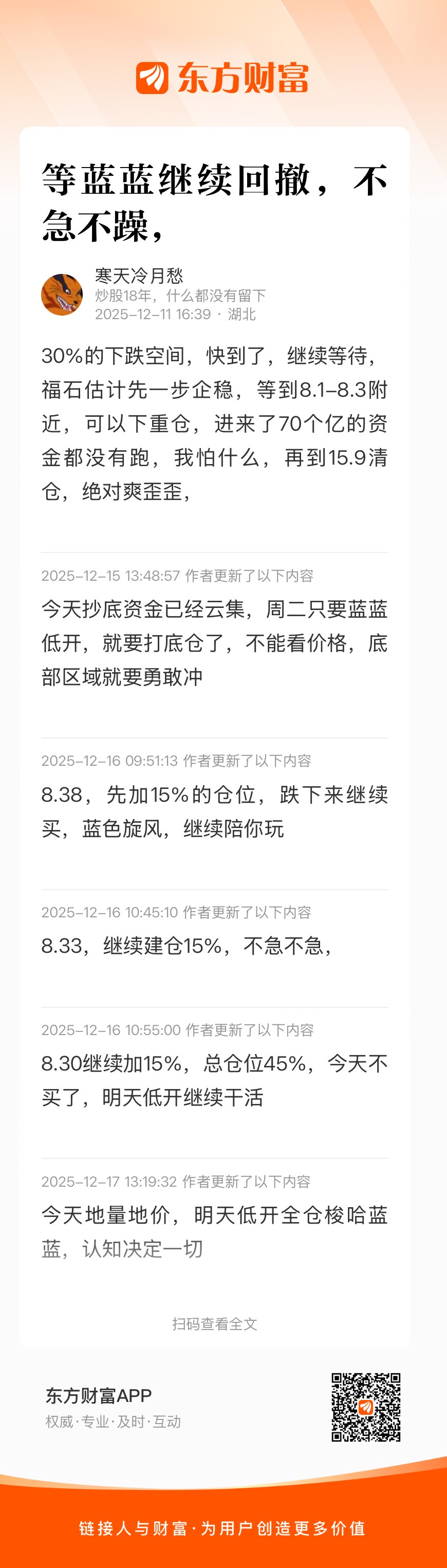 温馨提示: 1.根据《证券法》规定,禁止编造、传播虚假信息或者误导性信息,扰乱证券市场;2.用户在本社区发表的所有资料、言论等仅代表个人观点,与本网站立场无关,不对您构成任何投资建议。用户应基于自己的独立判断,自行决定证券投资并承担相应风险。《东方财富社区管理规定》