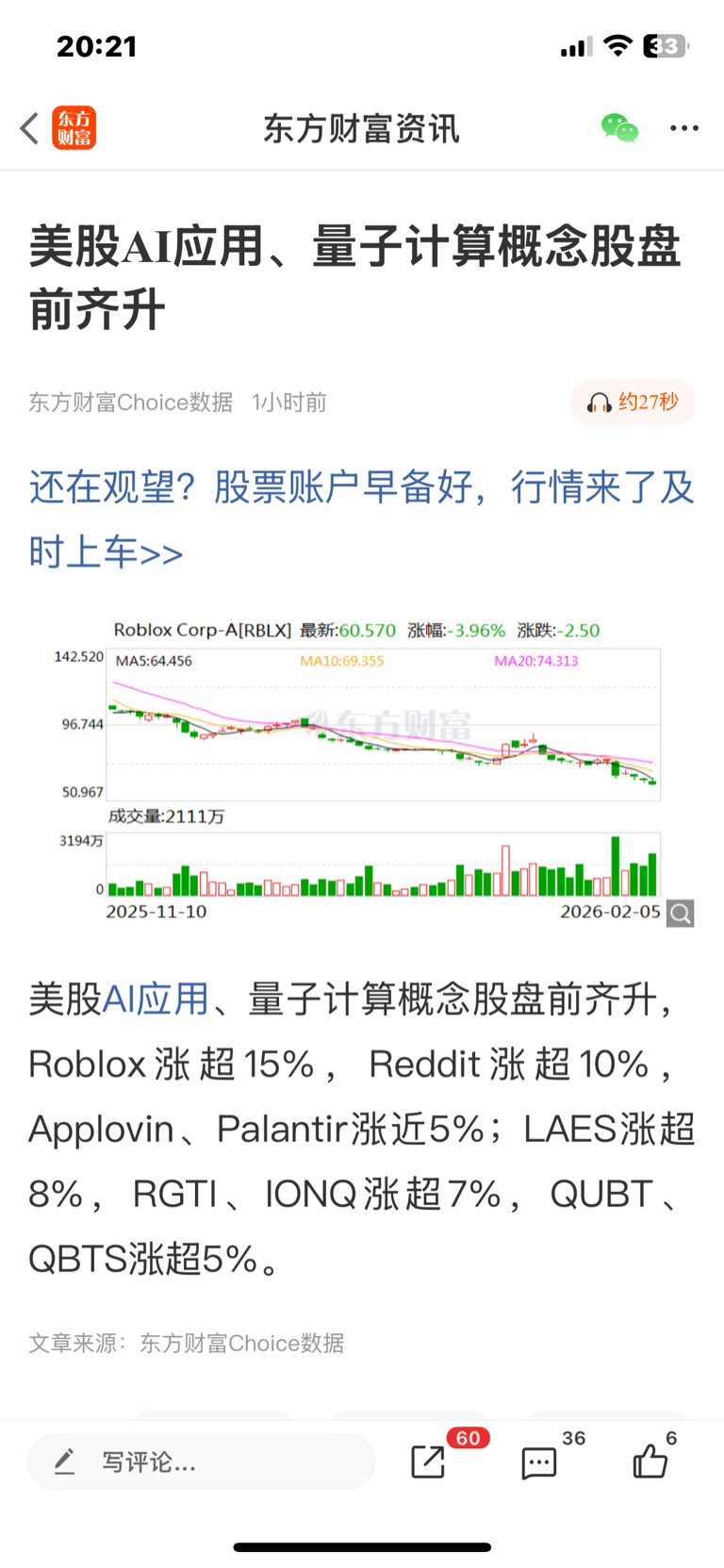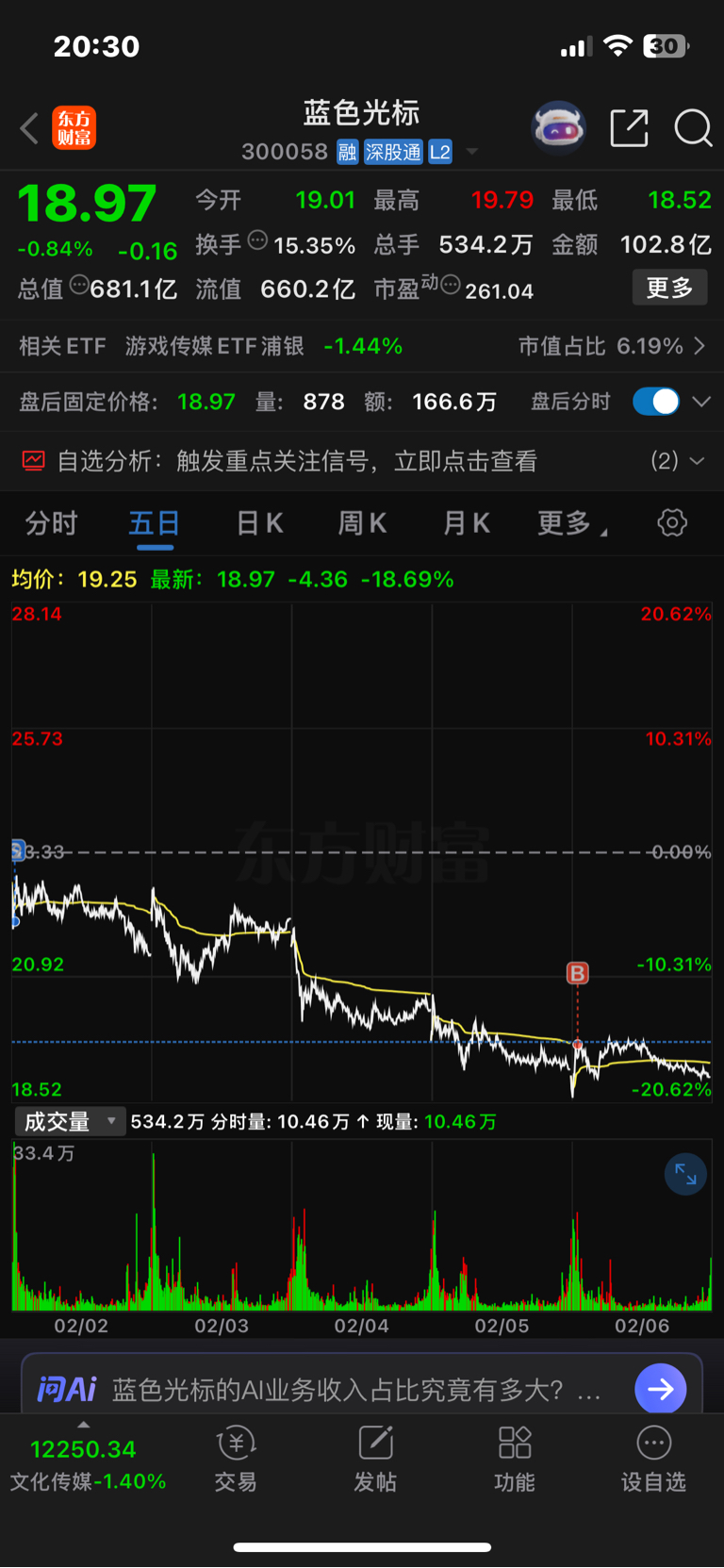 22卖的19.61追的这是我今天竞价把五粮液跟白酒ETF卖了想买医药没买到然后商业航天跟蓝色光标我就买了,红了几分钟收盘亏了1240块现在美股Ai应用暴涨下周一能不能大涨就不知道了我这60个点盈利都是商业航天跟Ai给的我又来了