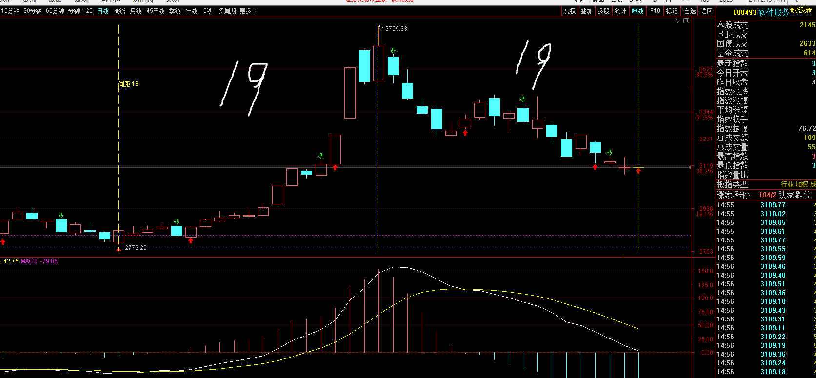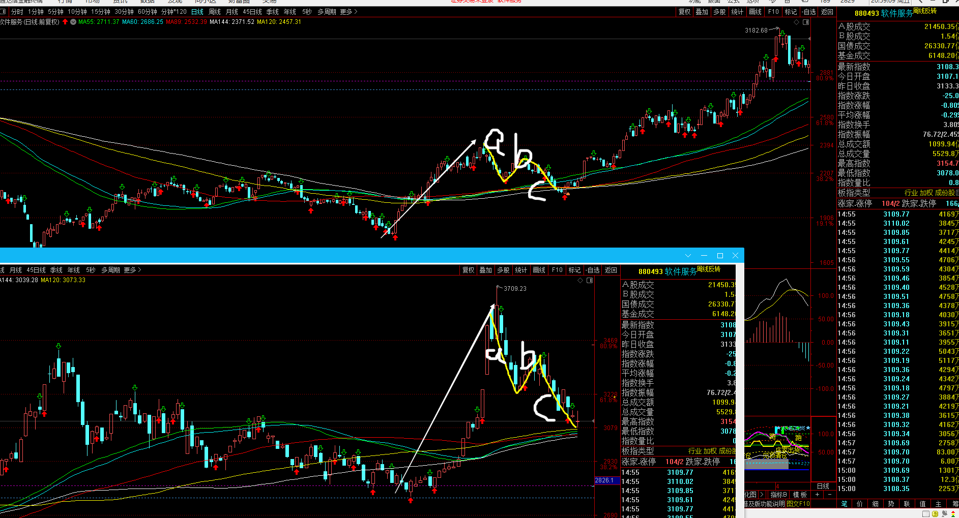我们再通过时间对称来计算一下软件服务指数,软件服务指数12月17号低点到1月14号的高点上涨的时间是19个交易日,从1月14号高点到今天为止回调下来是第18个交易日,星期一就是第19个交易日的时间对称,变盘的时间也就是在星期一或者星期二,软件这一次调整的时间是超出了我的预期,管理层三天两天出台管理制度,从管理层降温又到老米的软件大跌再到我们春节红包被暂停,这些都是导致成 AI应用延长了回调的时间的原因。