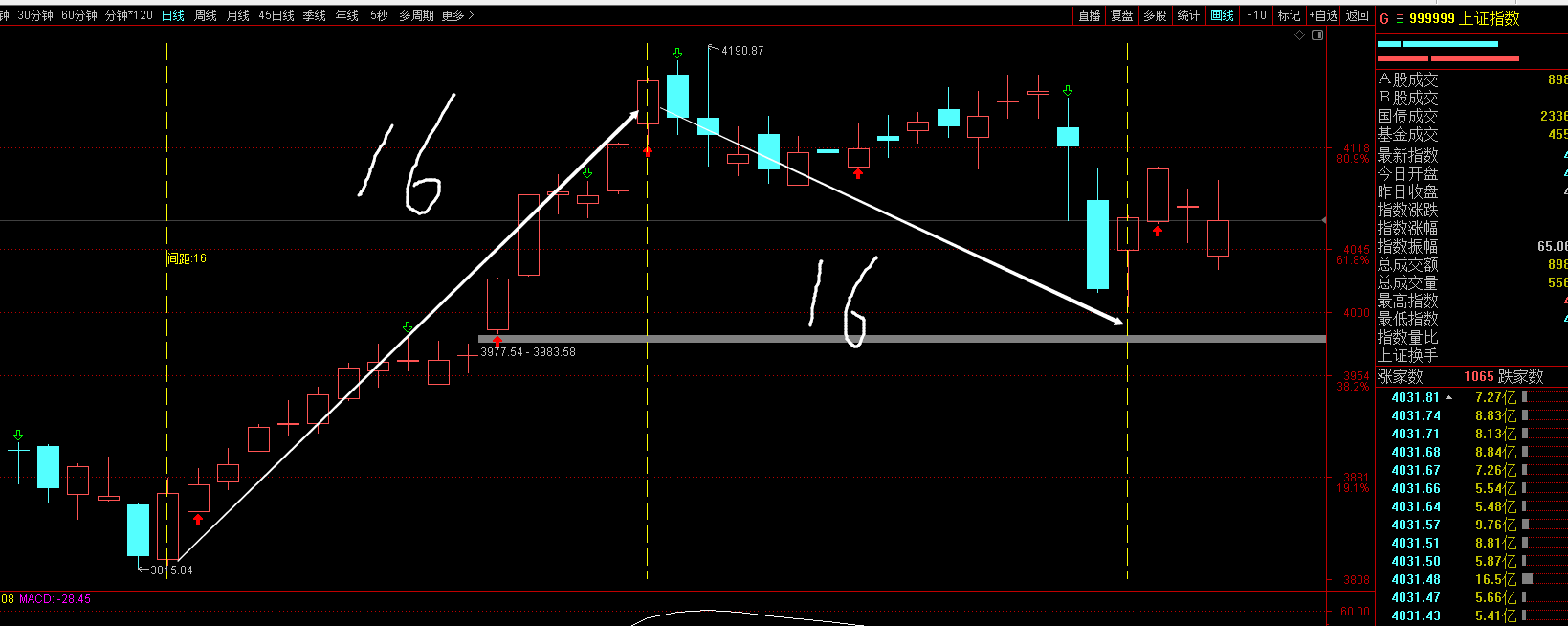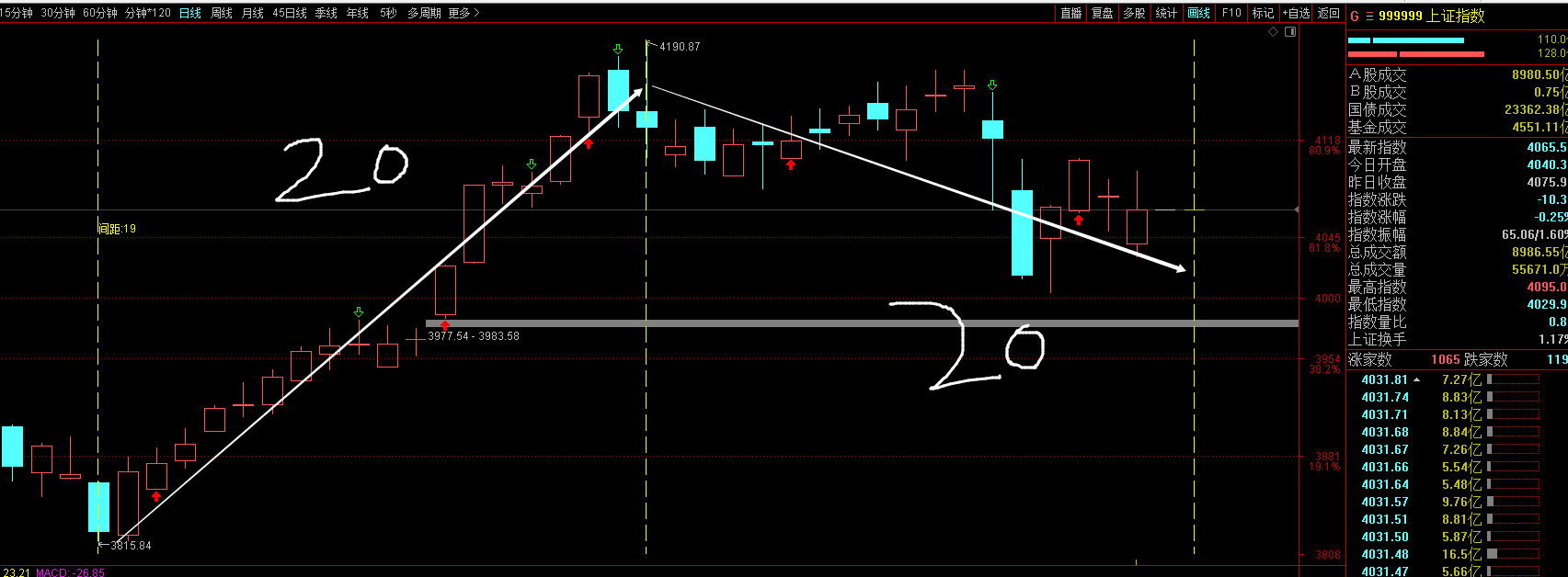 昨天在文档里面给大家讲了,昨天通过30分钟和60分钟看盘今天依然是有反弹,而且给大家讲到今天目标点位是摸一下4100,今天的最高点是4095点,离我说的4100点只相差5个指数点,昨天在文章里面还说了今天收盘到不了布林线中规上方4120,今天指数在外围市场大跌的情况之下我们这边 A股出现了的是低开高走,在盘中直播我也给大家讲了今天的支撑位是4020点,今天的最低点是4029点,这个还算是在预期之内的,昨天我也给大家讲了今天指数大概会是冲高回落,在今天下午的盘面当中尾盘的一个小时,基本上都是以回落为主,指数收盘最终跌了10个点指数点