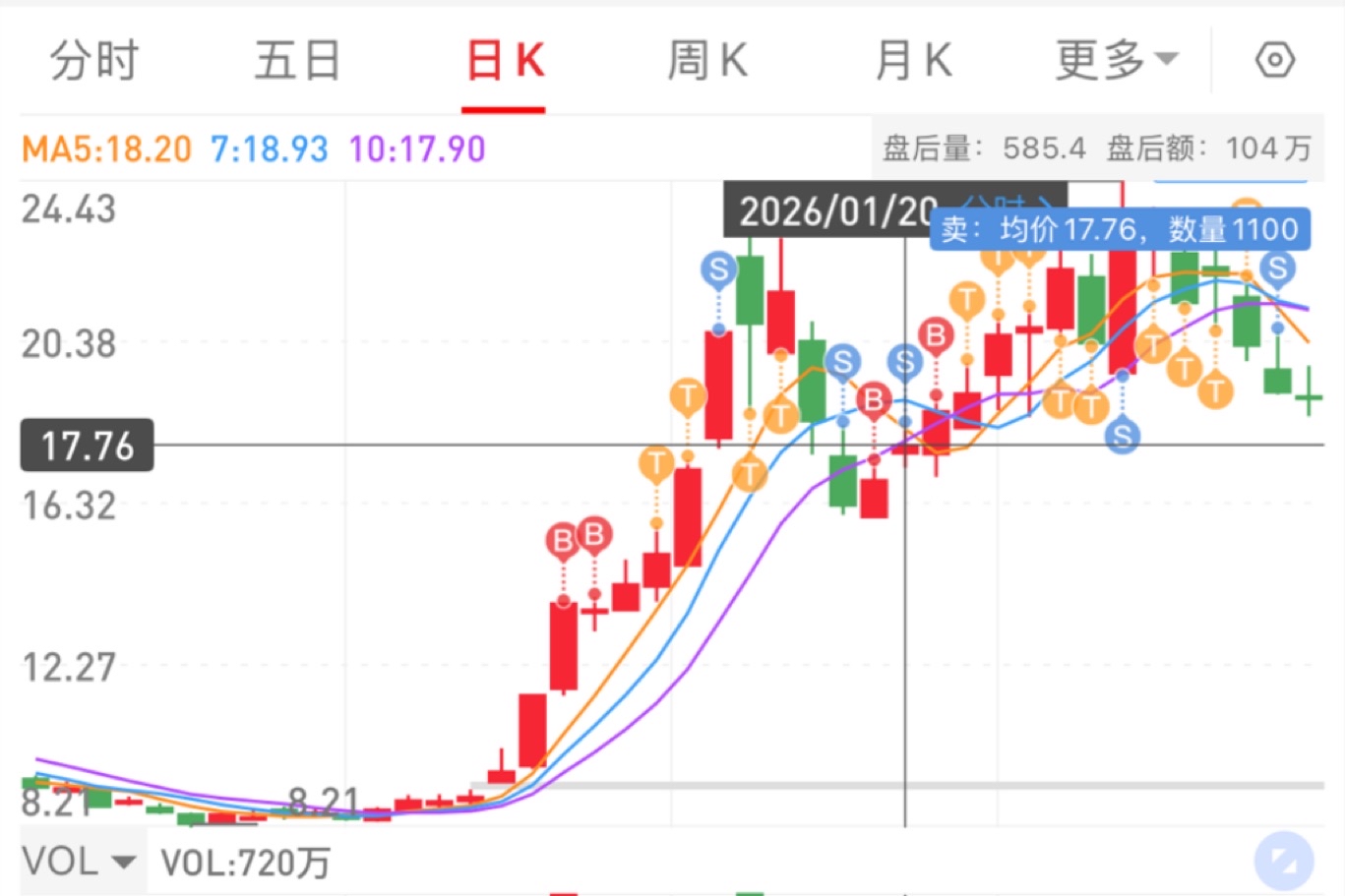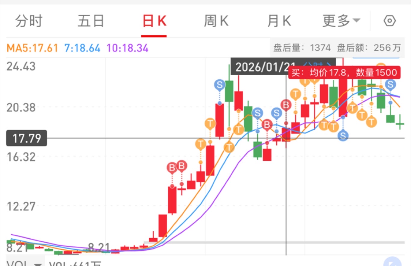 直到0121这天,开盘下杀以后经历简单的分歧,在均线附近震荡后大单拉升过昨日价格后,我确定蓝色光标这种票的二波要启动了,至于最后是双头还是二波主升,无法判断,但是至少还是有一定的空间。于是0121再过前一天的17.78的时候挂单进,最后成交金额是17.8。