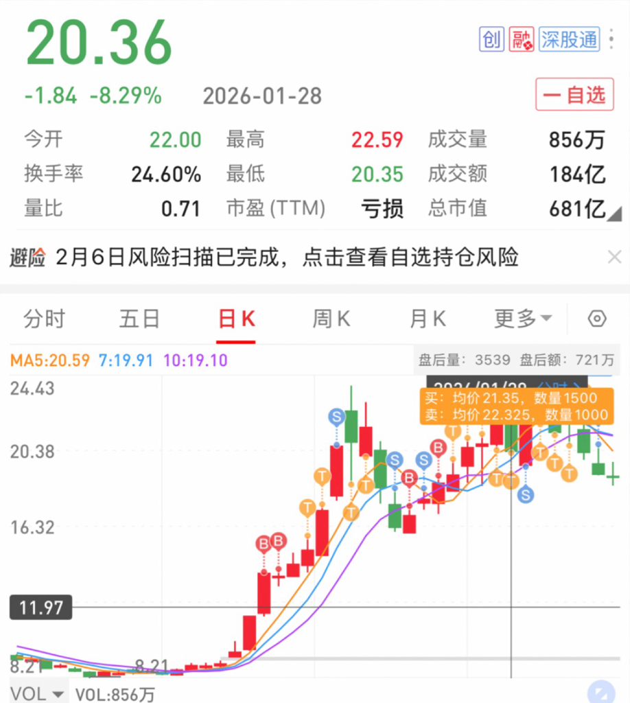 之后还是按照思路沿着五日线低吸高抛(有一天还高吸低抛了)直到0128,这天蓝标出现了分歧,但是当日情绪还可以,ai应用板块整体还是比较支棱的。因此当日做了一个加仓的t去博弈次日的修复。