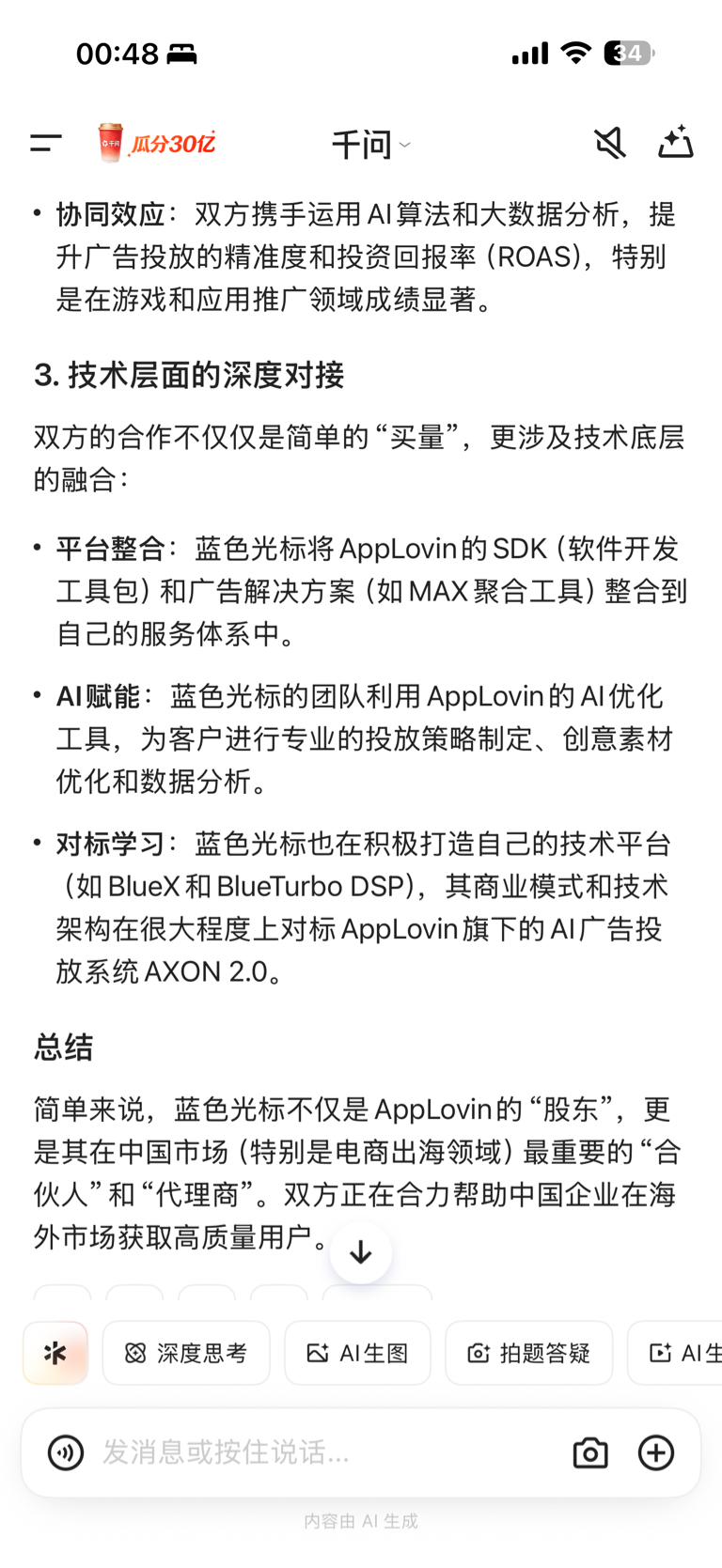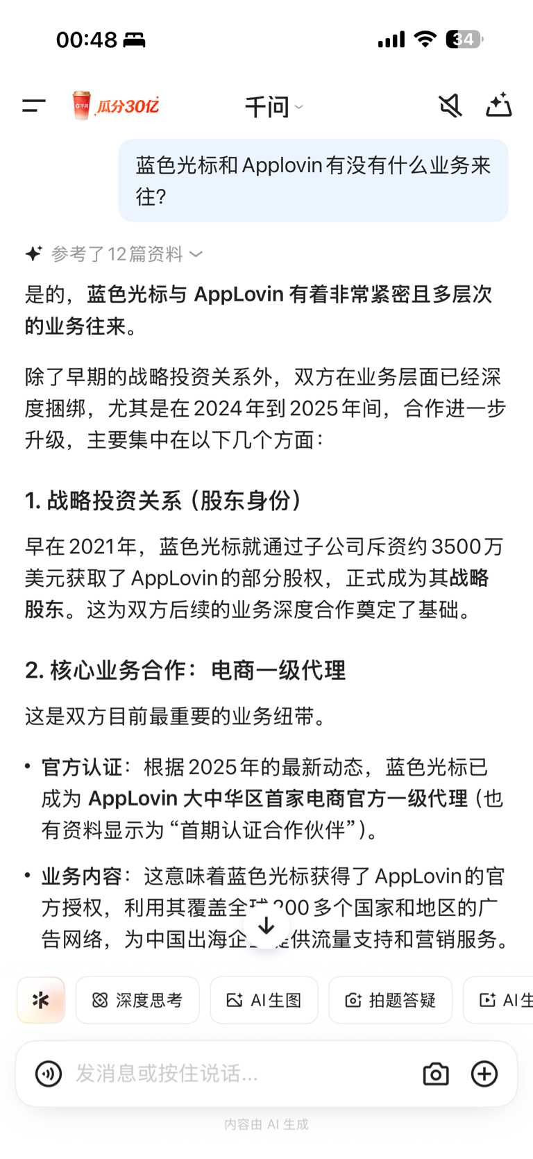 $蓝色光标(SZ300058)$ 美股AppLovin大涨,原来标哥不仅是AppLovin的“股东”,更是其在中国市场(特别是电商出海领域)最重要的“合伙人”和“代理商”。有戏。。。