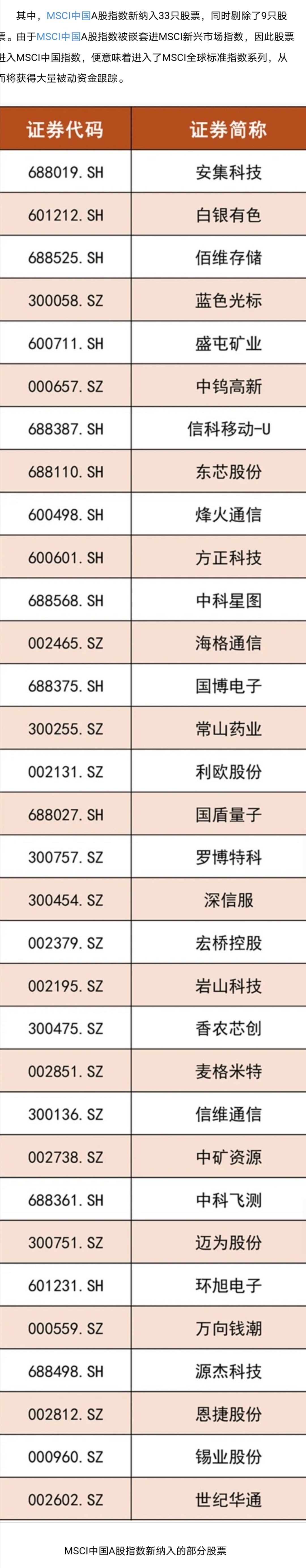 MSCI中国A股指数新纳入33只股票(附表格)