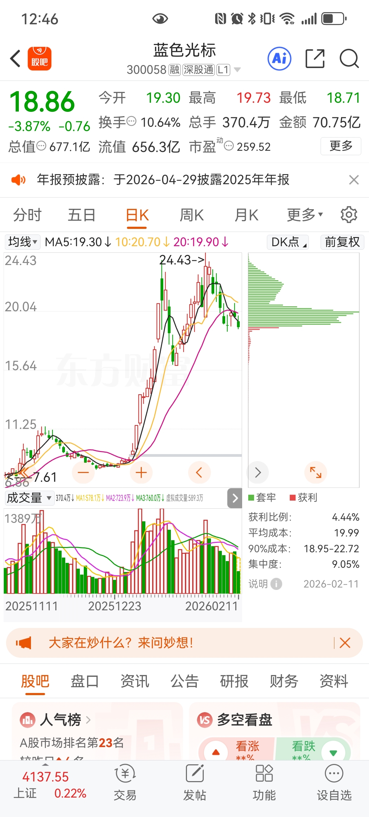 $蓝色光标(SZ300058)$ 今天筹码峰看,几乎已经没有盈利的人,都是我们套牢的,难道主力已经完全离开了,大跌在即?哪位懂筹码峰的兄弟指点一下。