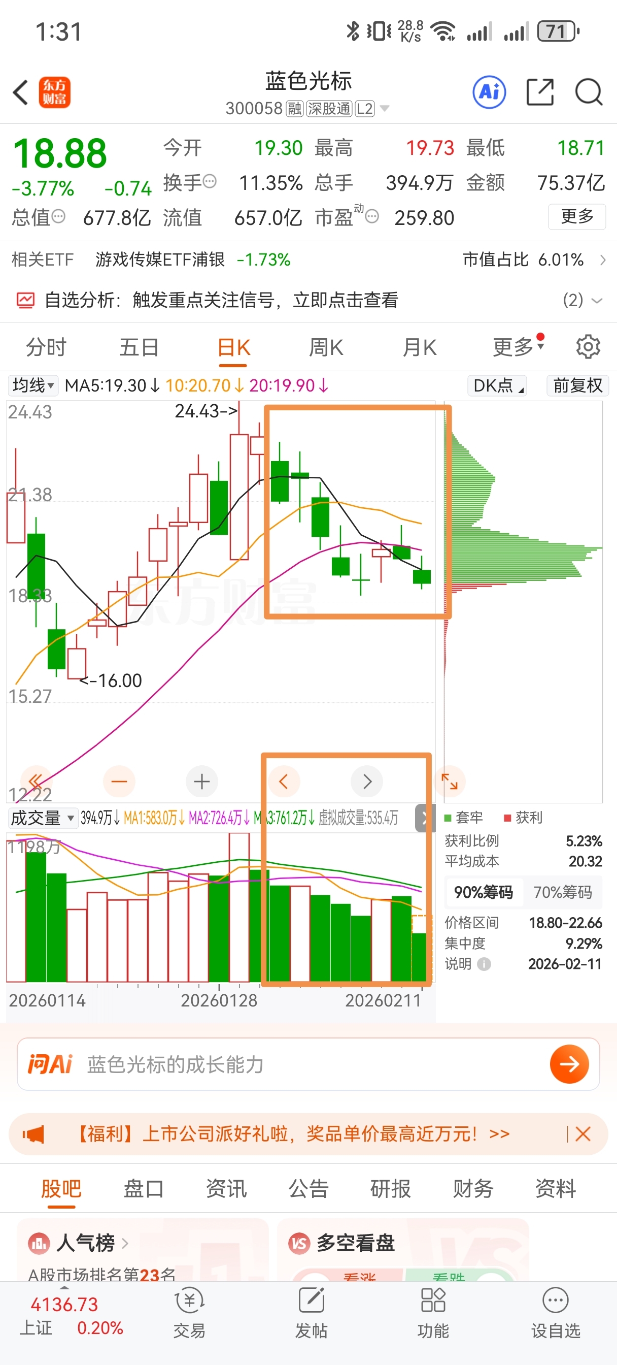 $蓝色光标(SZ300058)$ 因为一月的行情他们没抢到筹码,涨得过快,然后就人为限制,限制了二个星期左右,彪子没敢涨,如今二个星期跌下来了,他们托单拆小单收集筹码,每天缩量跑十几个亿,散户接十几个亿?他们通过托单以及拉人唱空,在加把彪子纳入了纳指,他们这几天收集大量筹码,配合黑嘴唱空,让很多散户亏损跑了。