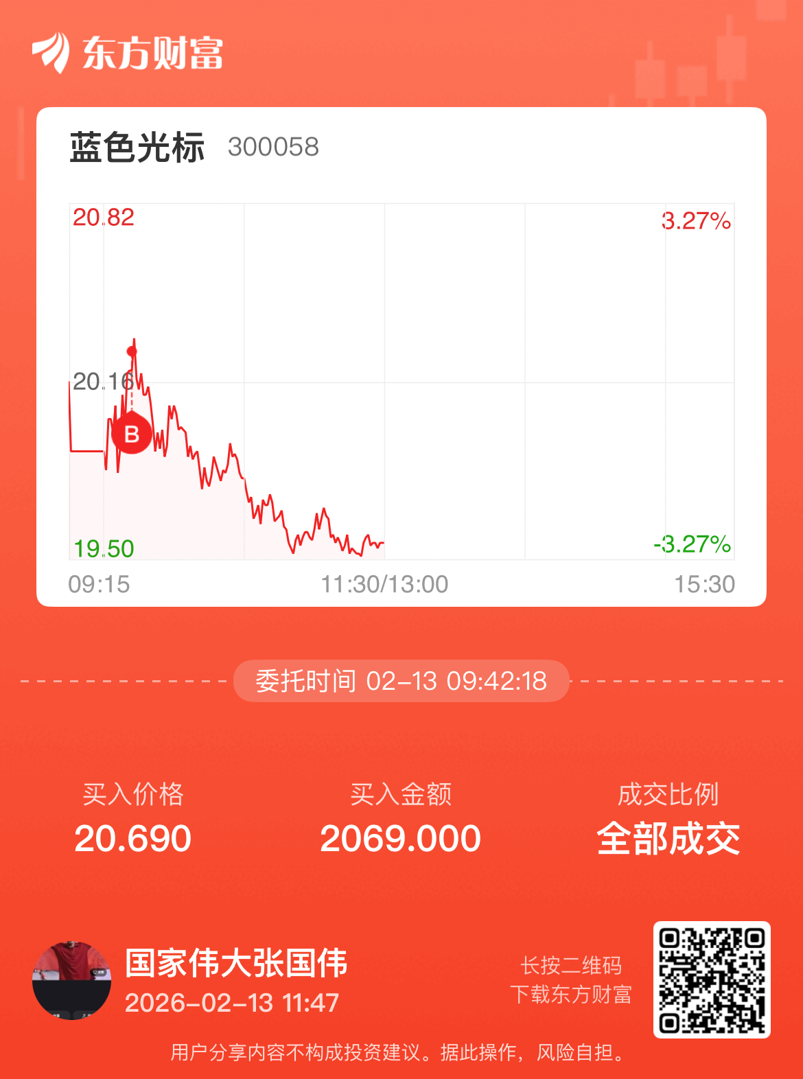 温馨提示: 1.根据《证券法》规定,禁止编造、传播虚假信息或者误导性信息,扰乱证券市场;2.用户在本社区发表的所有资料、言论等仅代表个人观点,与本网站立场无关,不对您构成任何投资建议。用户应基于自己的独立判断,自行决定证券投资并承担相应风险。《东方财富社区管理规定》