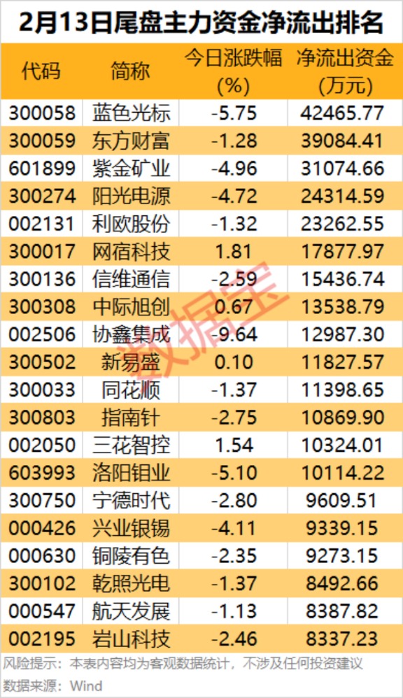 据数据宝统计,14股尾盘主力资金净流出金额均超1亿元。蓝色光标尾盘净流出金额达4.25亿元,居首;东方财富和紫金矿业尾盘主力资金净流出金额居前,均超3亿元。
