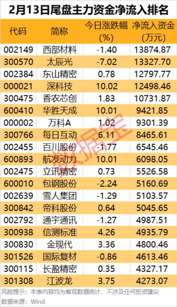 此外,还有太辰光、东山精密、深科技、香农芯创和华胜天成等尾盘主力资金净流入金额居前。