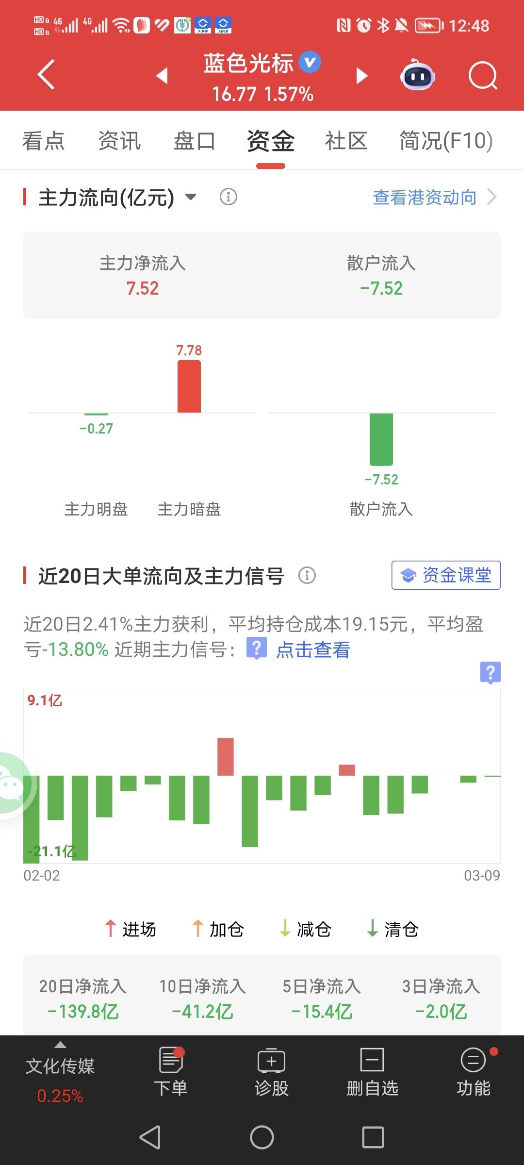 $蓝色光标(SZ300058)$ 今天光标勉强收复了5日线,全天主力净流入7.5亿,这是近10天来首次净流入过亿的,技术面图形走的太难看了,比较像进一退三,先看接下来3天能否守住五日线吧,这里还是不建议进场建仓,里面的如果明后天有冲高可以适当考虑下减仓。