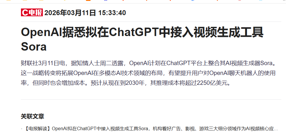 电报解读】OpenAI拟在ChatGPT中接入视频生成工具Sora,机构看好广告
