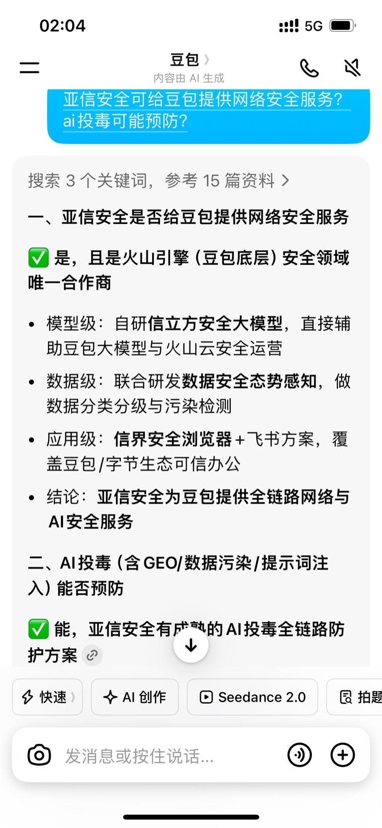 牛啊,问了豆包才知道亚信安全是豆包唯一一家提供网络安全的公司,ai投毒预防早就能