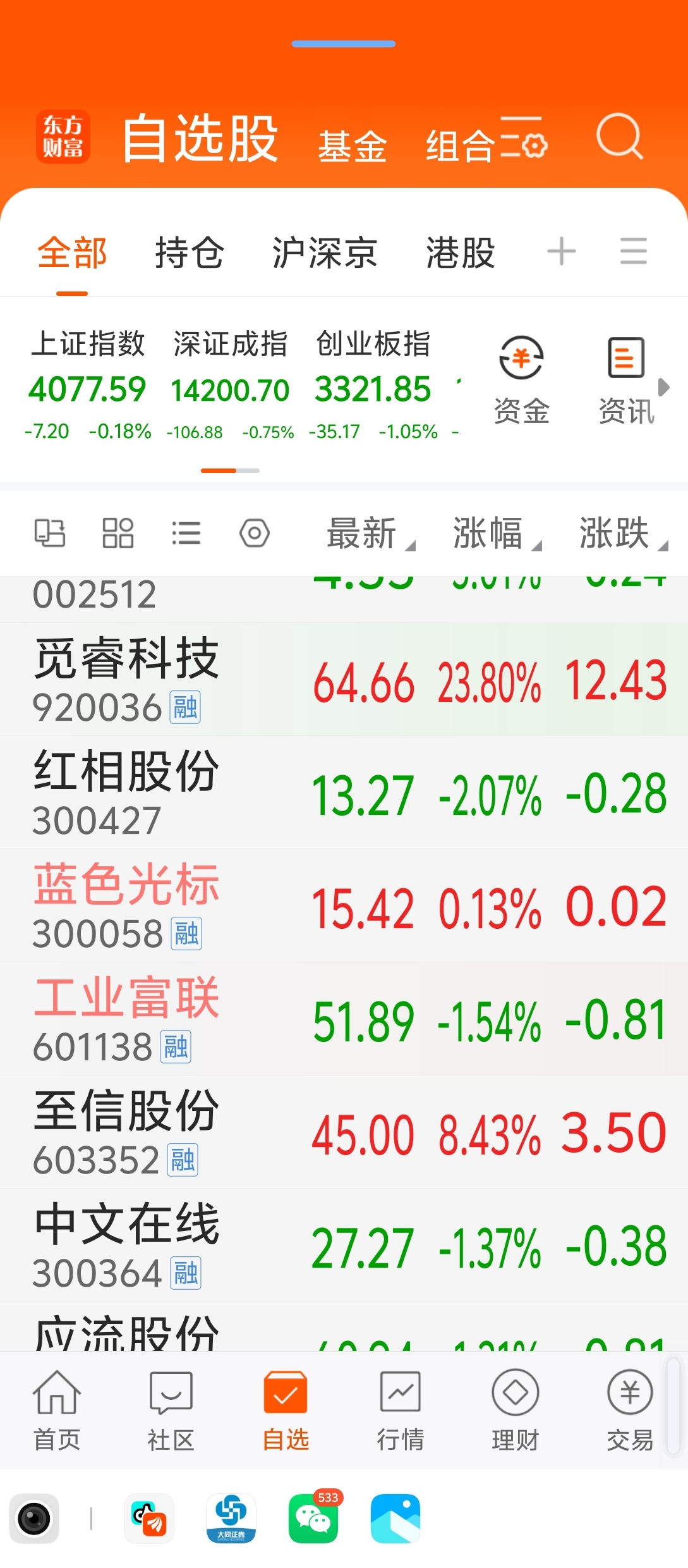 $蓝色光标(SZ300058)$ 上个礼拜五出了,从山顶24多一直扛到14块多,沙子一样天天跌拿着,昨天它涨了自己换的三个股都跌,今天不错换的两个大涨,希望这次把蓝补回来!至信股份和觅睿科技今天可以的,希望继续