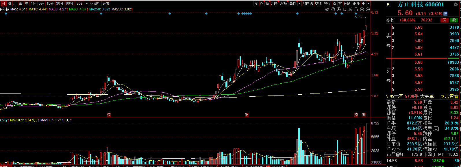 从上周五的分时走势图来看,拉升得非常的果断,直接走出了旱地拔葱的走势,不带一点拖泥带水,说明市场中的做多意愿较强,股价也是创了阶段性的高点,现在多方还是占据着优势,强者恒强,这周仍然还是有望继续受到市场的青睐。