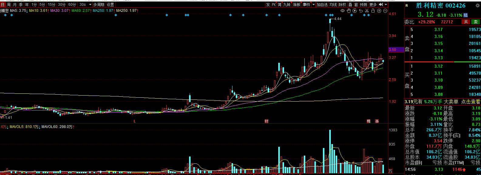他和胜利精密的走势很相似,都是量价关系比较配合,周一的走势很重要,我们需要在这两个股票里面去弱留强,格局一个就可以了。