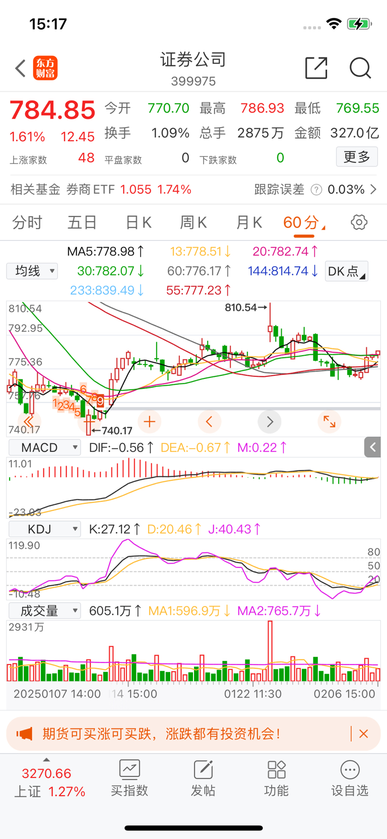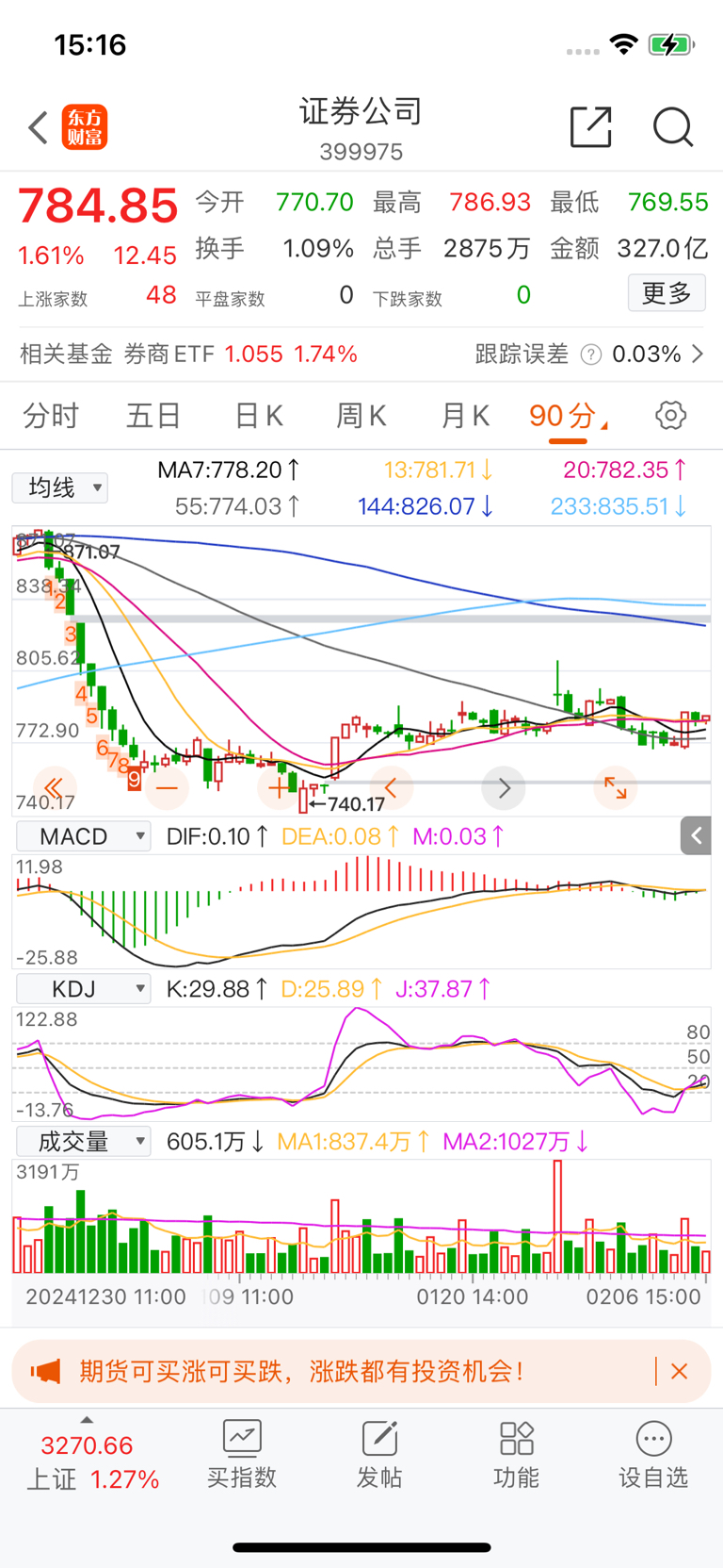 三大股指60分钟级别都在55k均线获得支撑,证券指数是先跌破又站上,仍然是弱了一些的。