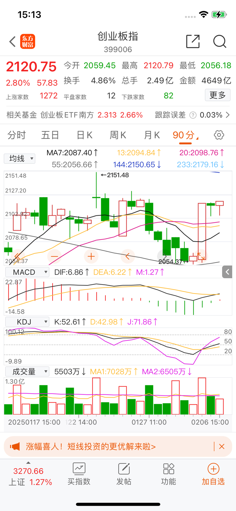 上图,创业板指数可以看得很清楚,快慢线及m值三一致向上,0轴上金叉,多头态势。