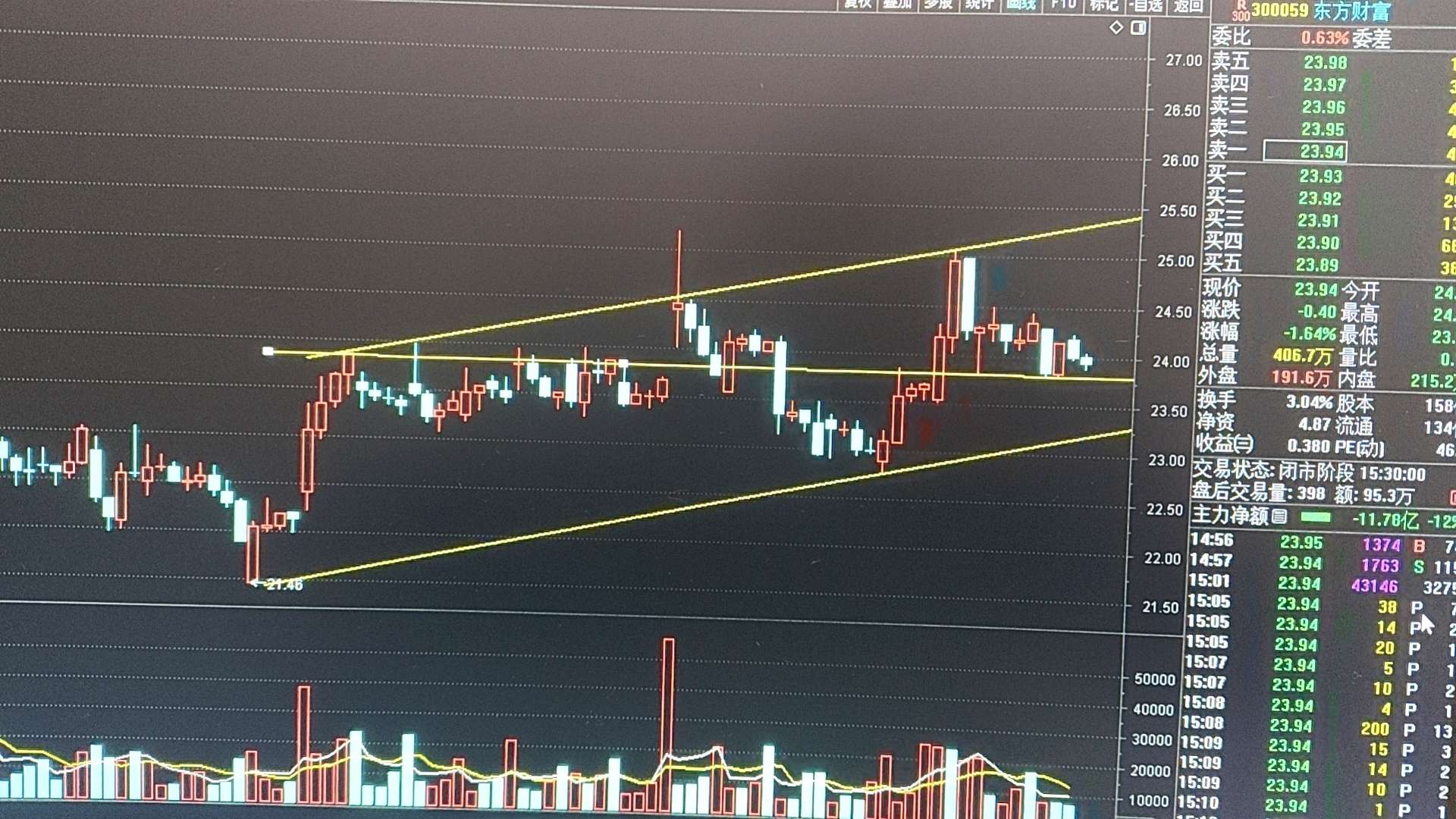 东财60分钟K处于上涨趋势通道中,今日再次试探23.85元支撑位,如果明天再次缩量,去破23.85的可能性并不大!短线选手可利用通道上下轨做小仓位高抛低吸,但最终大方向还是往上,这是战略性方向不变!