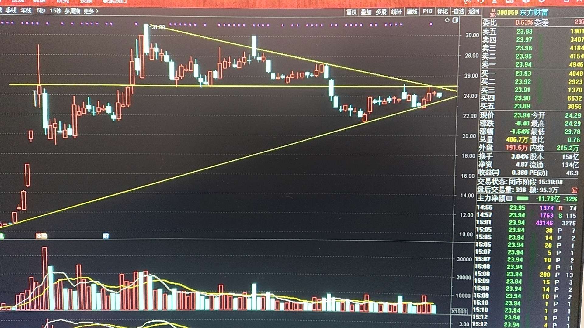 东财日K同样收缩量小阴K,在收敛三角形未端震荡蓄势,对于上周五倍量阳的上影试盘线,正常调整也就两三个交易日,上方有着下降趋势线和24.9平台压力线,不放量是无法向上突破的,耐心等待给出方向性选择!