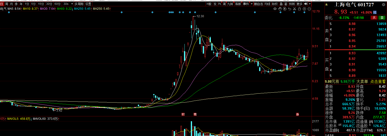 $上海电气(SH601727)$上海电气601727:公司是电力设备+智能电网+人形机器人概念股,领先的风电核电机组、燃气轮机、输配电设备等装备制造集团。现在的市场高低切换明显,上海电气现在位置低是一个很重要的加分项目,同时公司的题材和基本面还是不错的,下方多条均线都是拐头向上,无论是从基本面技、技术面还是位置来看,这样的个股都是容易受到市场的青睐,短中期的趋势都是向上的,行情还没有结束,后面依然还是有望走出波段性的行情,关注水下的承接。