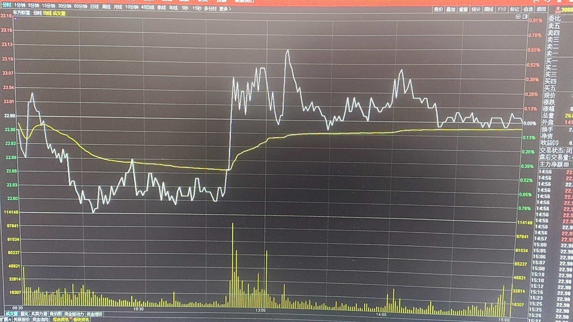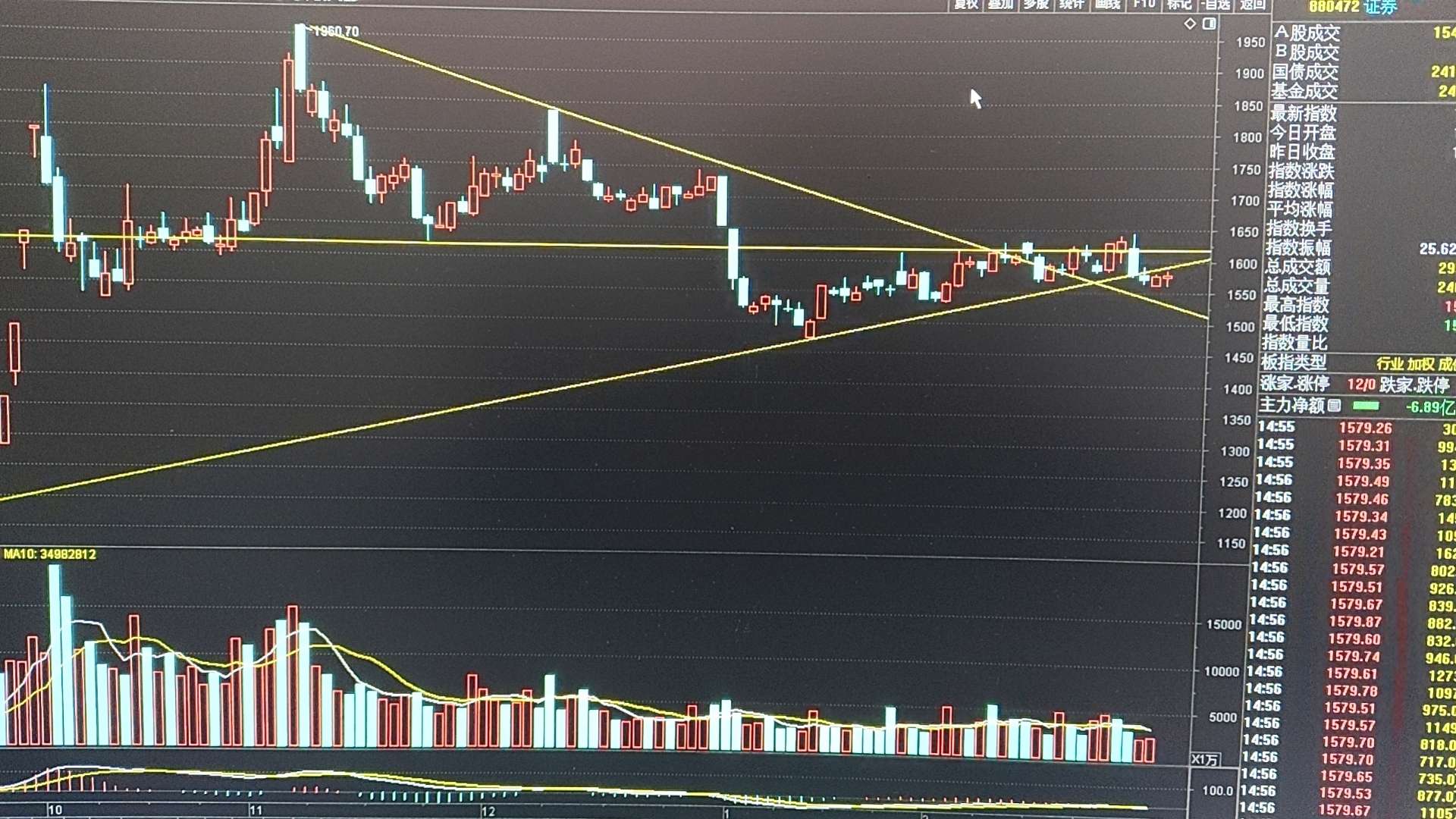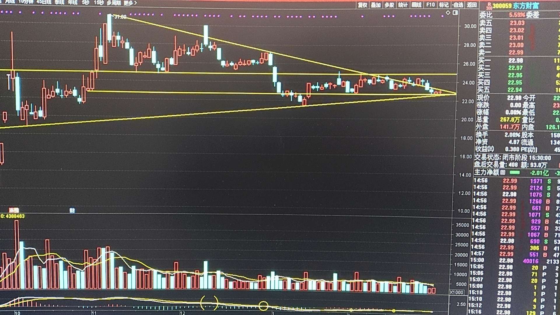 东财日K也再次出现次地量十字星,运行到收敛三角形末端,也意味卖盘的极度衰竭和买方的不作为!5日均量线标准都达不到,收出突破性阳线机会就很渺茫!但这种地量注定没有持续性,明后两天K线会在三角形末端选择方向!