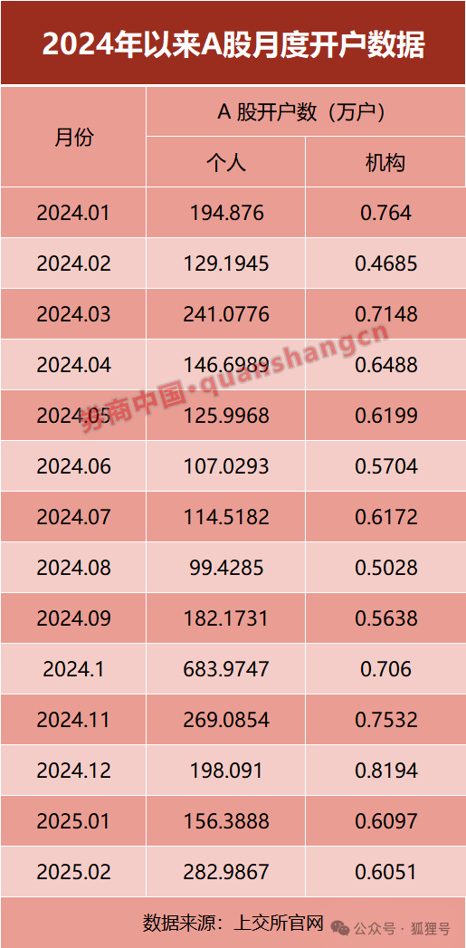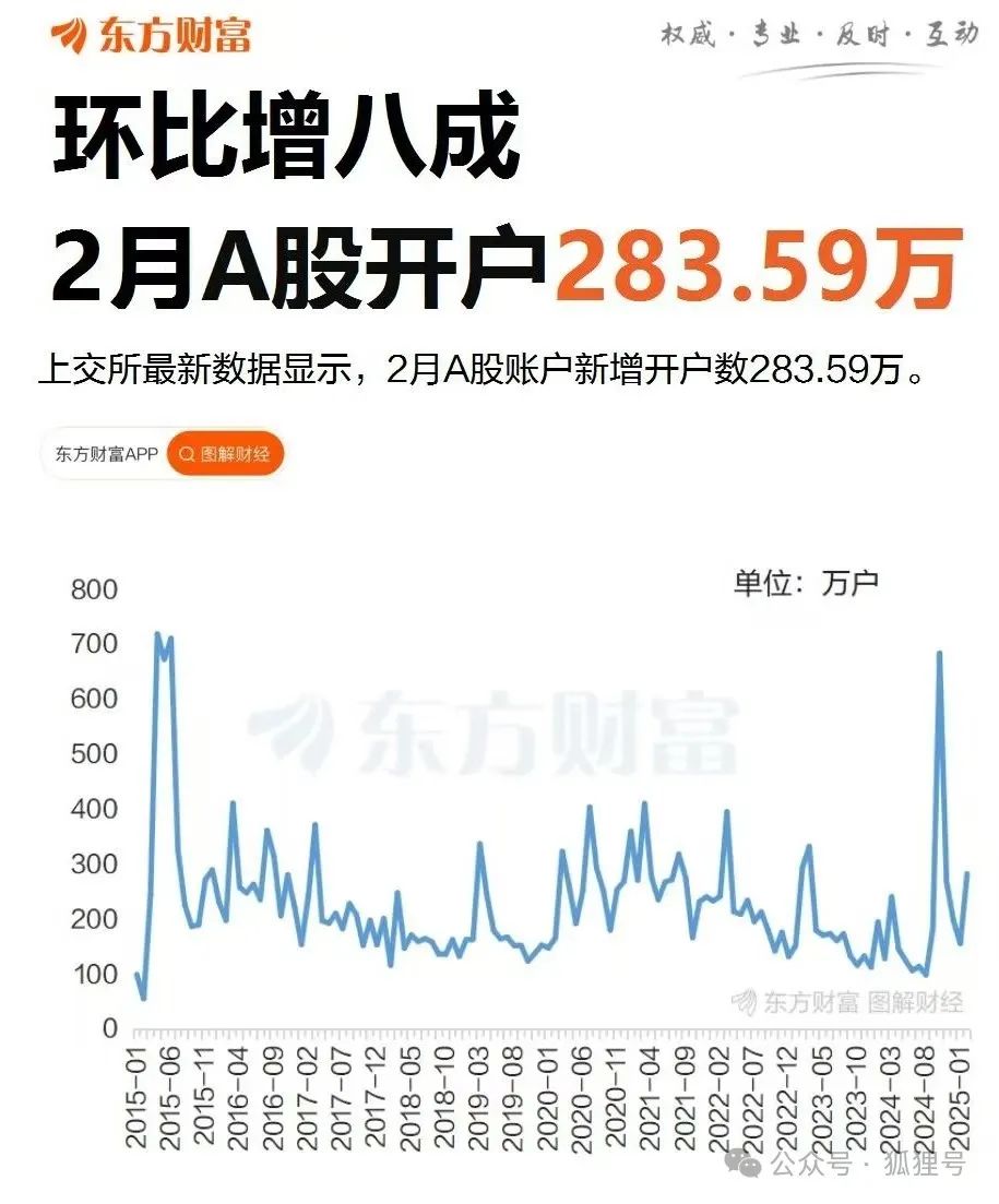 二,上海证交所最新月报数据显示,2月A股账户新增开户数283.59万,比1月的157万增长80.6%。从2023年4月至今,这一数字仅次于2024年10月的684.68万户。