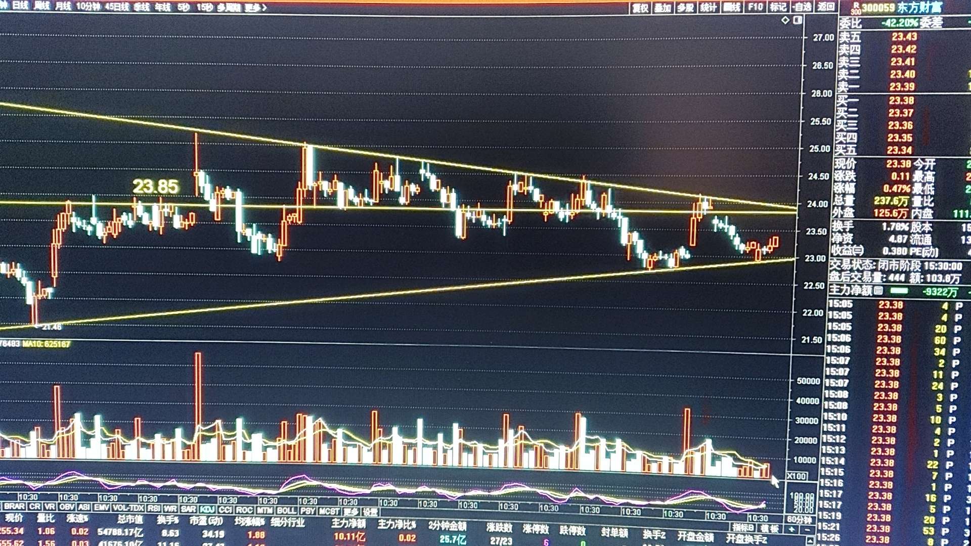 东财日K小幅放量收出光头小阳k,依然落在下降趋势线上方,由于缩量,依然在22.8-24.9元箱体内,关注突破60日线和24.9元两个压力位时量能的变化!
