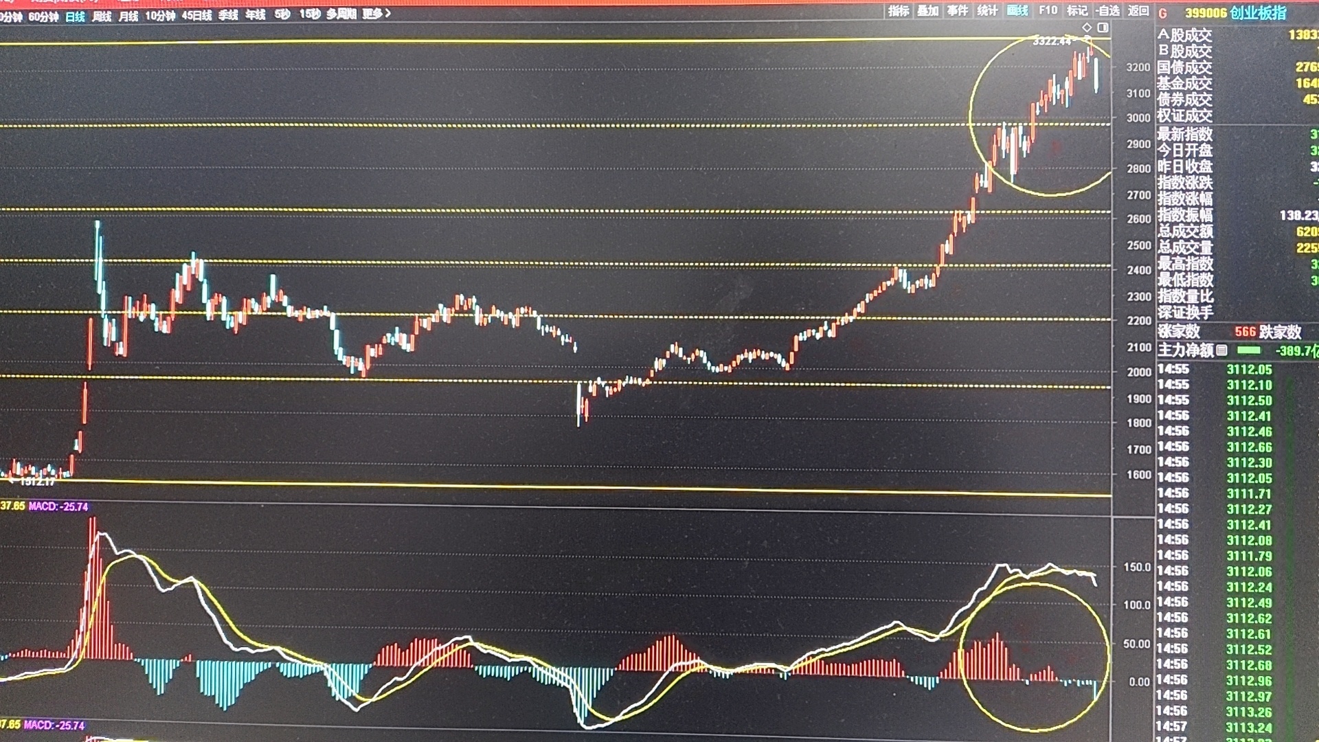 这是创指日K图,截至昨日3322.44三对数高点,比去年9.24行情高点涨幅近似翻倍,整个9月指数不断创新高的同时,下方的红色量堆越来越小,做多动能趋于衰竭,表明市场投资者在此位置并不愿花更多钱去承接这里的卖盘,涨得多不是看空的理由,买盘的衰竭才是。今天的中阴K留下了跳空缺口,形态非常难看,也是为科技股的估值修复埋下伏笔!