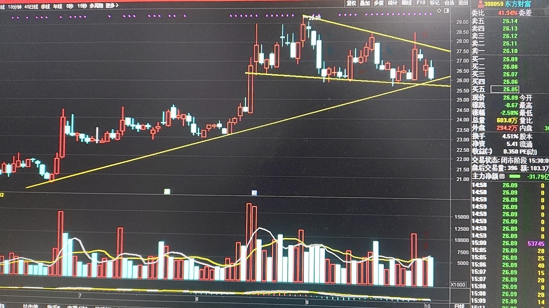 东财日k弱于证券板块,同样收出平量小阴K,加上昨日的假阳K,连续三天收出平量阴K,这种量价关纟也表明主力处于锁仓状态,买卖双方都不活跃,筹码集中度数值下降了0.3%,这种二次试盘后的调整正常不会太久,一旦突破倒楔形上轨,将会打开向上的空间加速,今天是理想的二买低吸点,如果做确定性更强的买点,就是做突破上轨的三买点,虽然价格会更高,可靠性也更强!