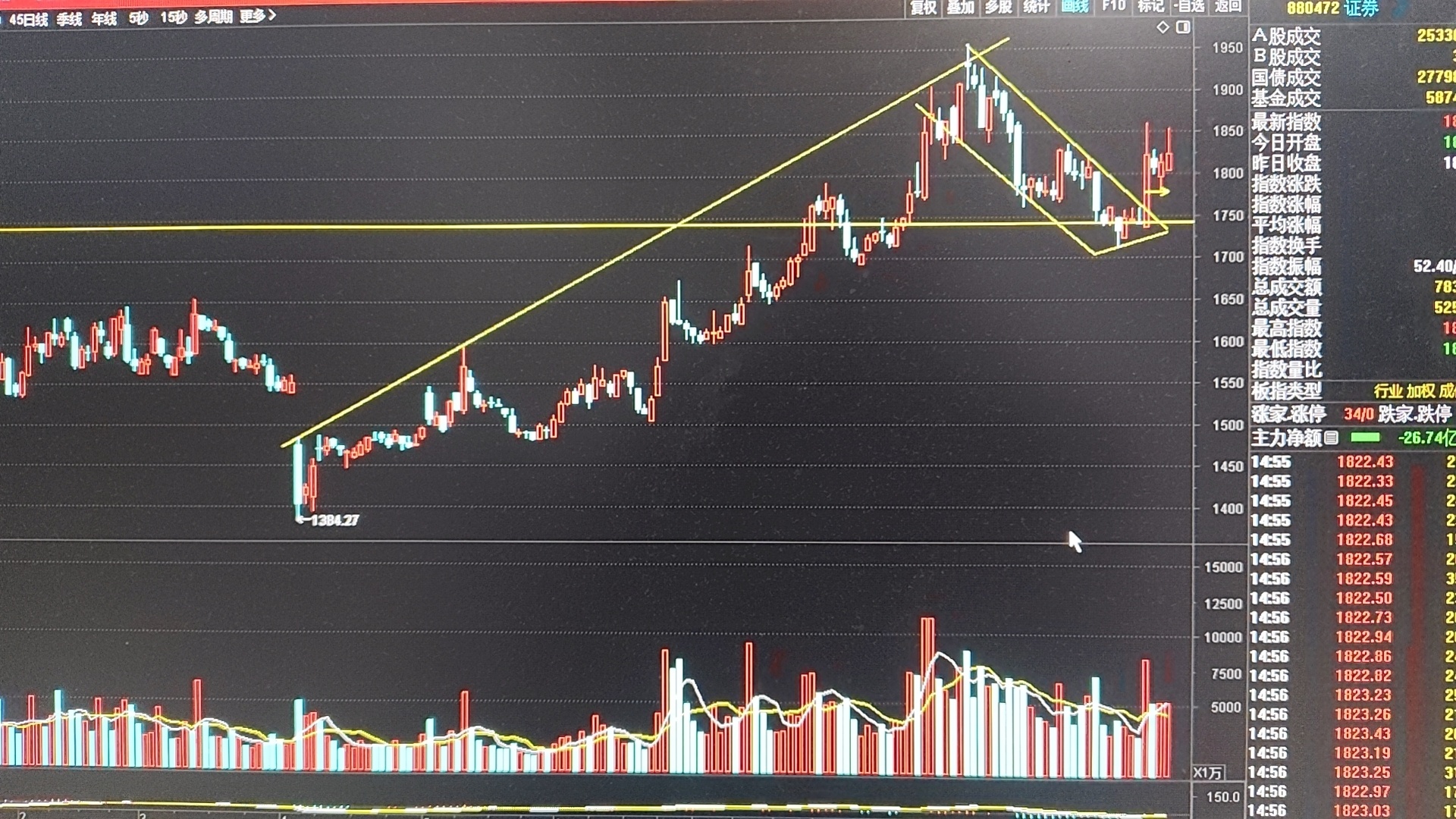 证券板块今日继续收出平量小阳k,仍在放量试盘阳线半分位上方整理夯实 ,由于3浪4的形态走出旗形整理结构,而且巳经突破旗形上轨,那么后市的涨幅大约等同于旗杆的高度!