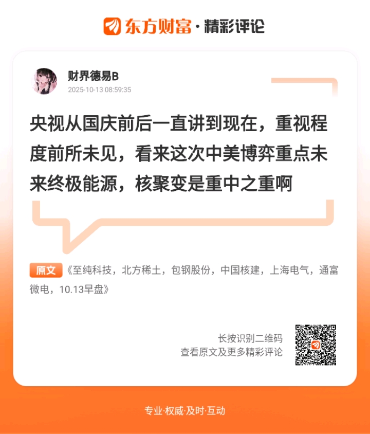 周末最火的就是关税消息,不少人都在复盘四月的炒作逻辑,稀土永磁、农业、半导体这些方向当时涨得猛,新周大概率会高开;还有核聚变,央视从国庆讲到现在,重视程度拉满,明显是中美博弈的重点方向。不过也得注意,要是高开后承接弱,高位出口多的票可能有抛压,这时候有业绩、位置低的券商说不定会出来护盘。新周操作记住:“追高不如等回调,有逻辑就多盯,没逻辑就避开”,别被开盘情绪带跑偏。