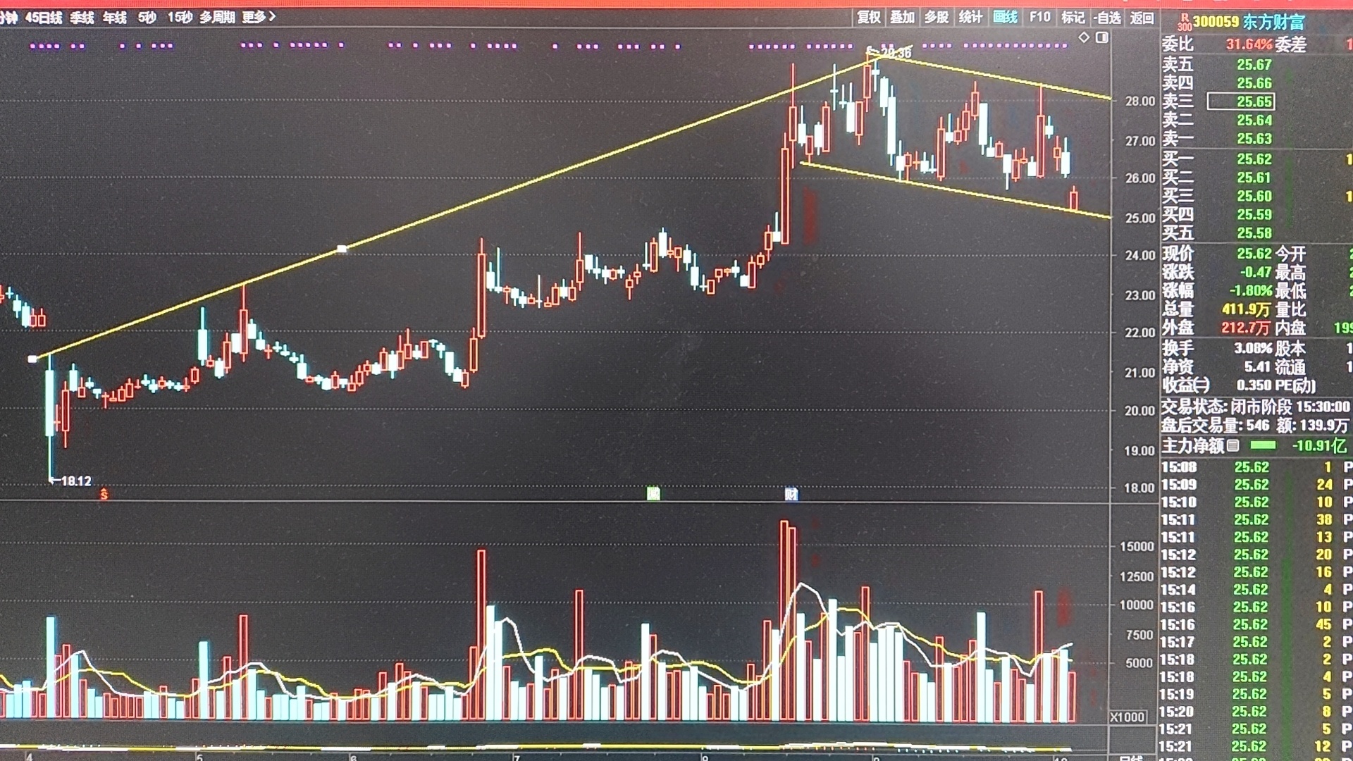 东财日K明显弱于证券板块,今日收出跳空缩量假阳K,开盘价刚好打在旗形整理形态下轨,也是创出近一个多月的新低,那么从29.36元运行至今天已经有25个交易日,把它定义为3浪4的调整,与3浪1的24个交易日,3浪2的26个交易日周期相吻合!伴随60分钟和120分钟的底背离,阶段底的概率较大!