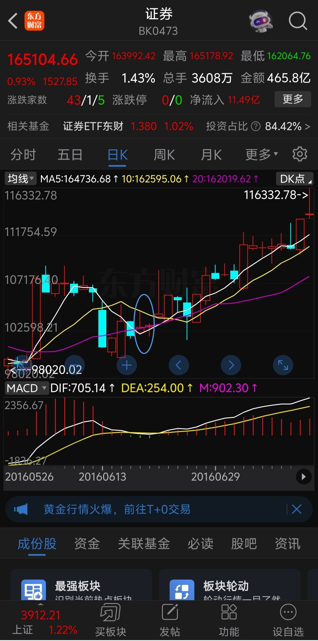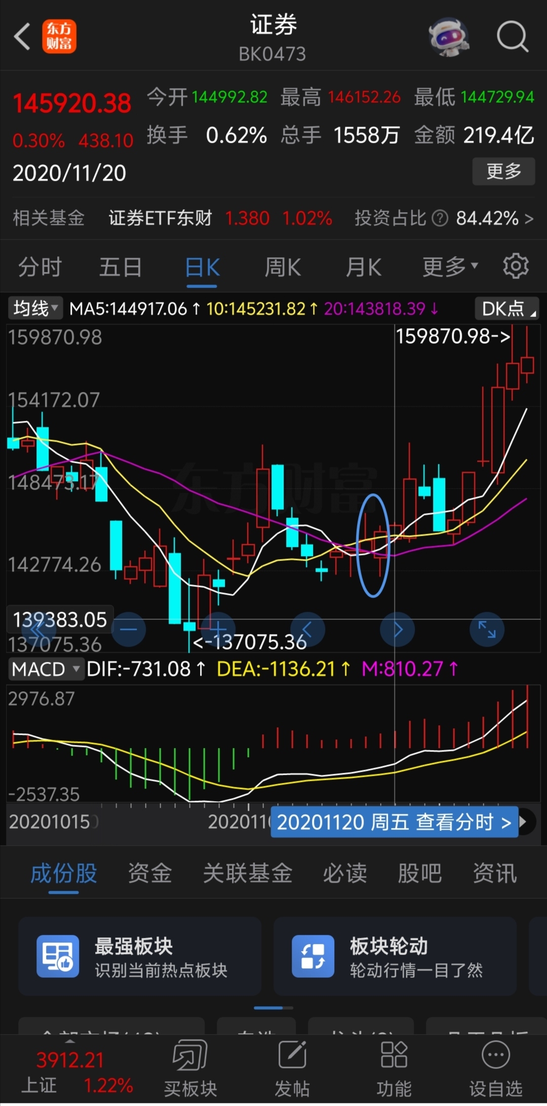 证券板块显示两根见底反转的K线图组合信号,“冲高回落+探底回升”的底部揉搓线。预示后市有一波大行情已经启动。