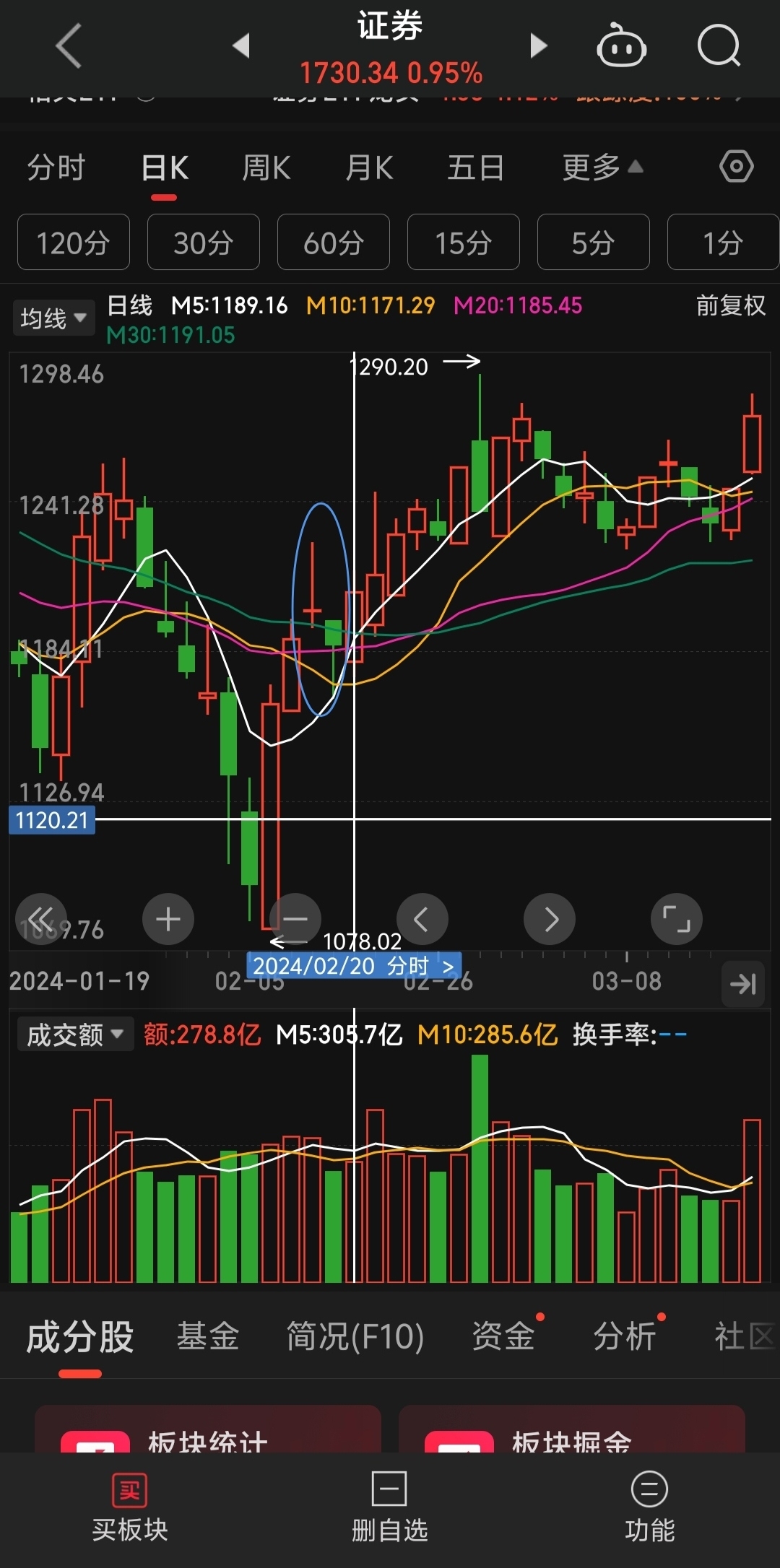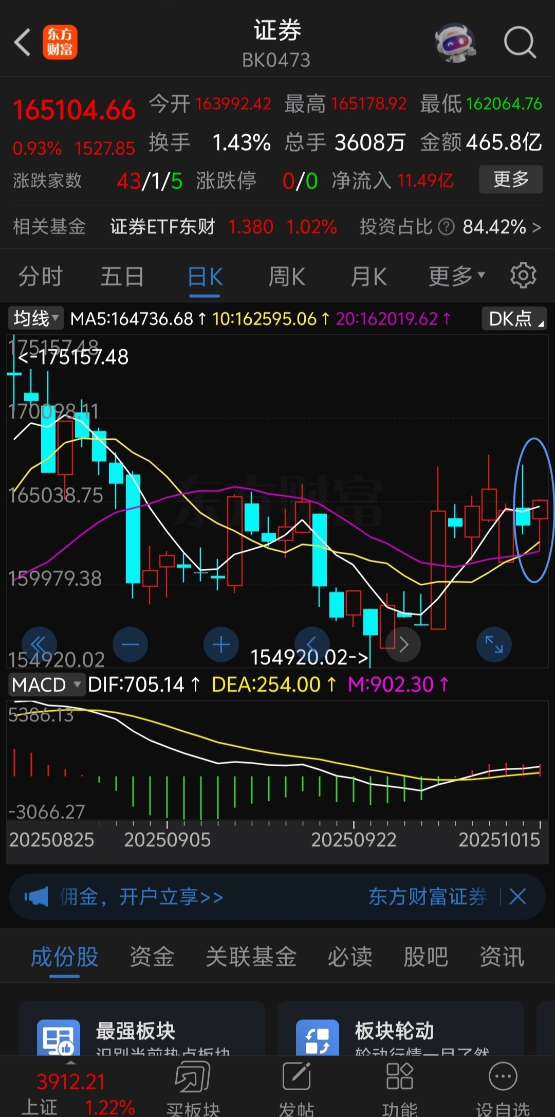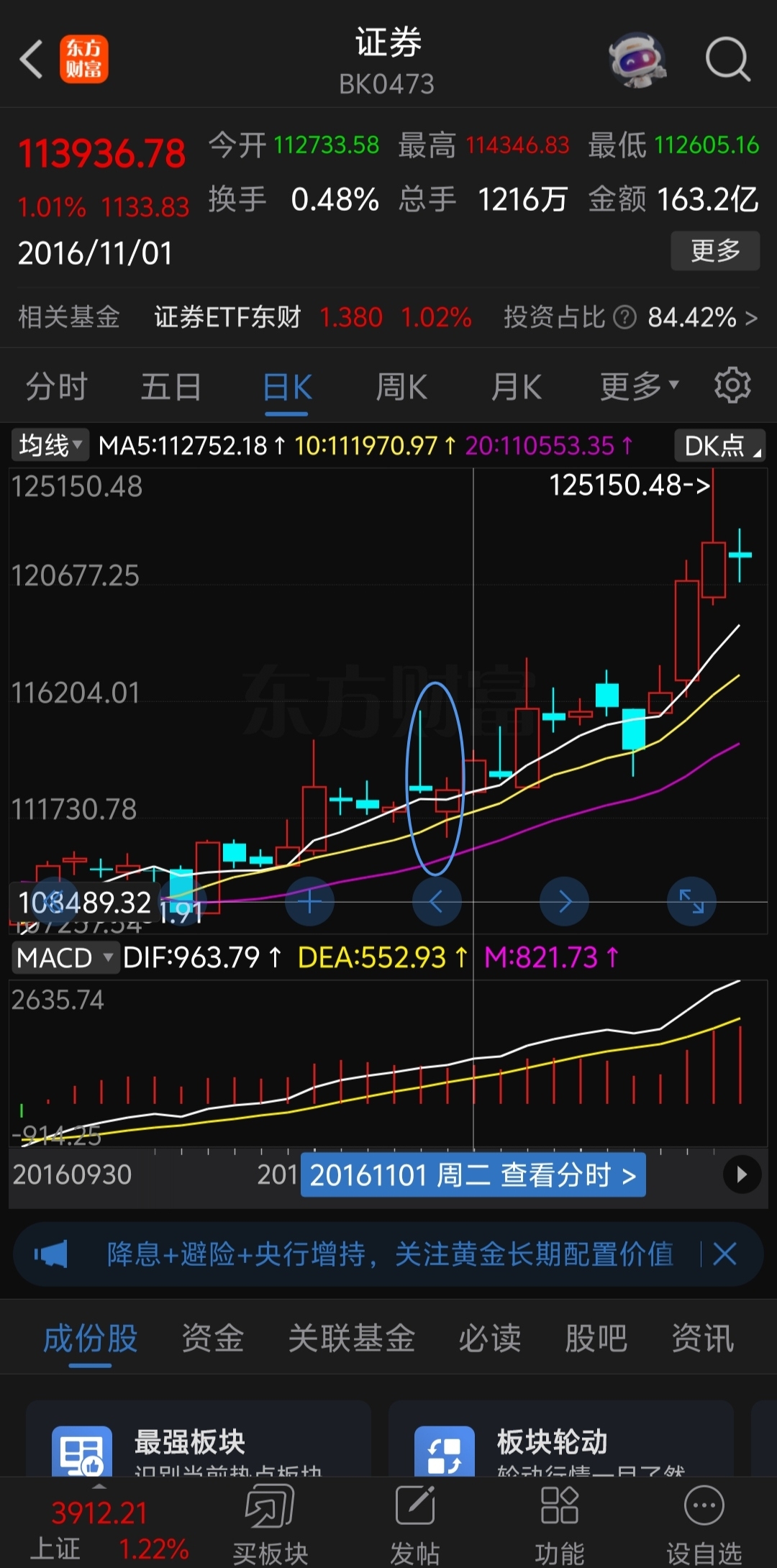 证券板块显示两根见底反转的K线图组合信号,“冲高回落+探底回升”的底部揉搓线。预