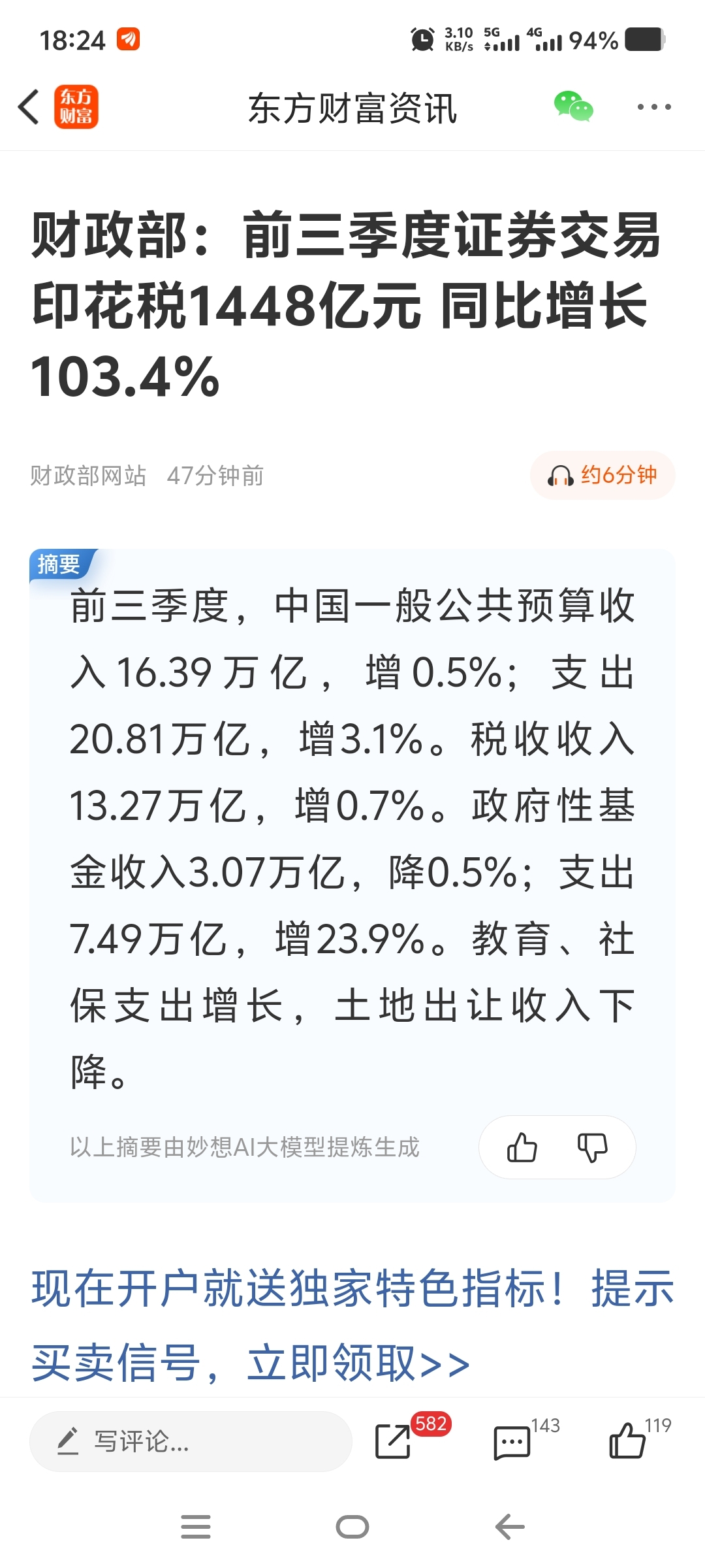 前三季度证券交易印花税1448亿元 同比增长103.%,金融街论坛重磅消息出台,下周券商大涨!