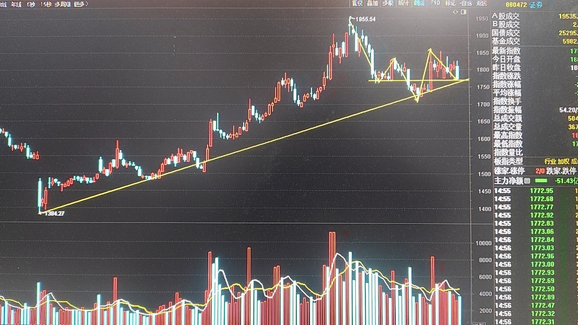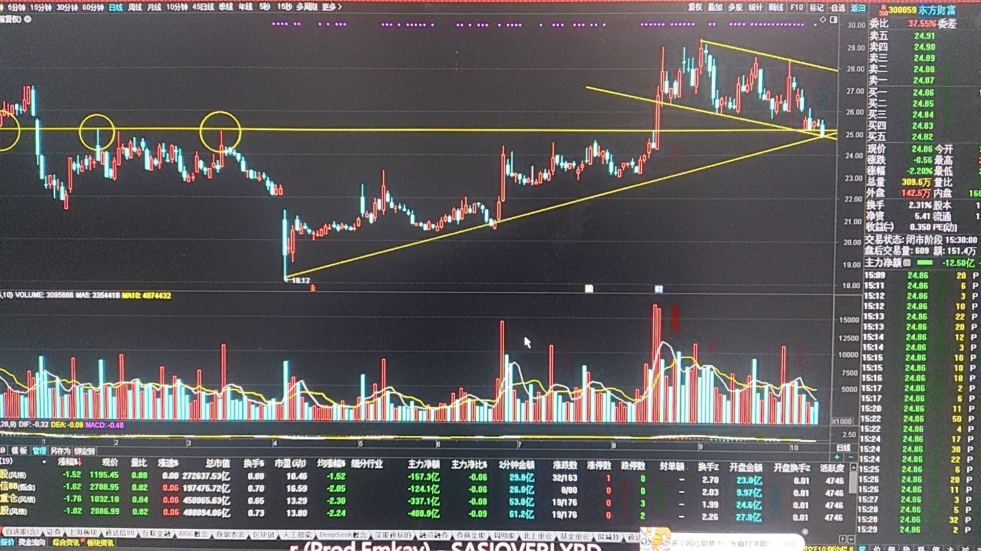 东财日K在昨日刷新60亿地量纪录后,今日早盘冲高后全天震荡下行,成交量在尾盘放量比较明显,因为盘中砸破了近三日低点25.12元的心理价位,导致恐慌盘夺路而逃!但凡这里的放量买方不会是散户行为!今日低点位置稍破旗形通道下轨,但仍在上涨趋线上方!