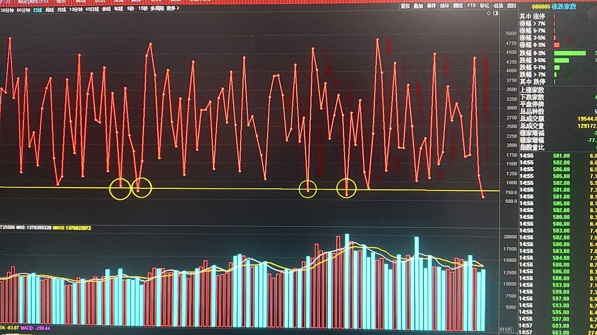 今天市场就是以储能,光伏,消费电子,元器件杀跌为主的泥沙俱下的普跌行情,情绪指标涨跌家数进入603冰点区域,每次到达800以下冰点区域,次日都会迎来普涨修复行情!