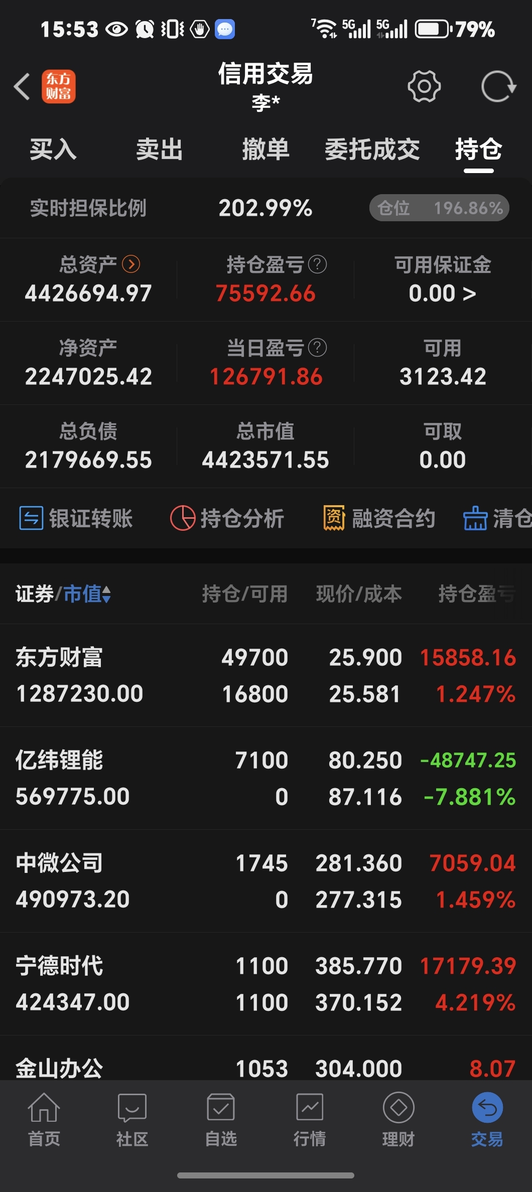 $东方财富(SZ300059)$ 满仓满融回本路 今作 加仓东方财富 亿纬锂能和中微公司做t