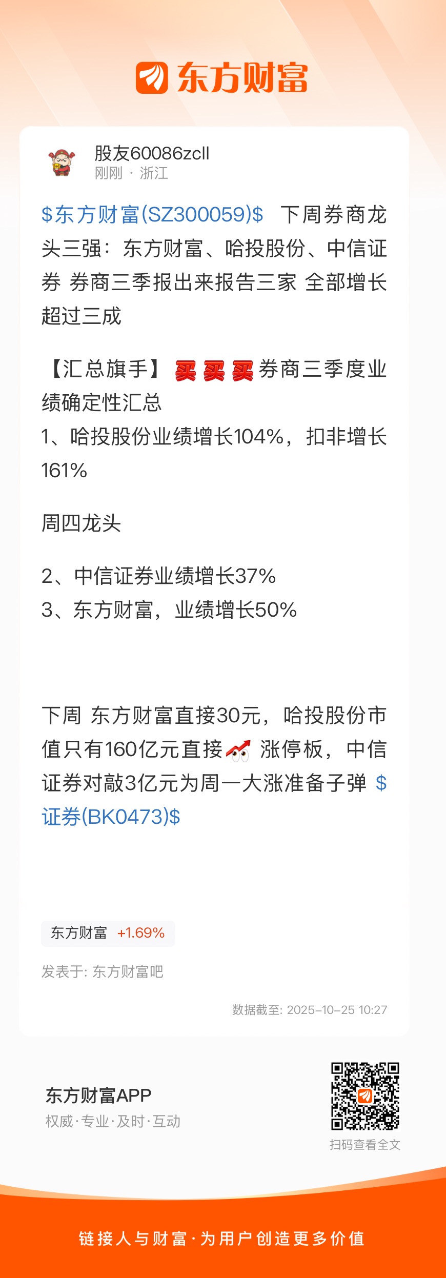 $东方财富(SZ300059)$ 下周券商龙头三强:东方财富、哈投股份、中信证券 券商三季报出来报告三家 全部增长超过三成