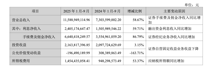 整体来看,今年前三季度,公司营业总收入达115.89亿元,同比增长58.67%;净利润为90.97亿元,同比提升50.57%。公司前三季度净利润已逼近去年全年水平,2024年全年净利润为96.1亿元。分业务看,利息净收入与手续费及佣金净收入均实现显著增长。