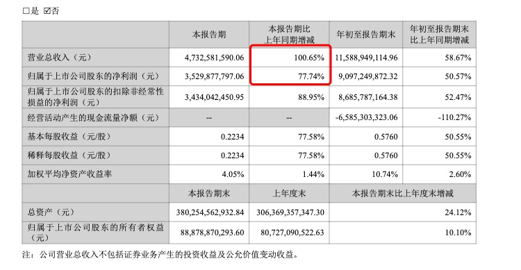 10月24日晚,东方财富披露三季报。第三季度实现营业总收入47.33亿元,同比大增100.65%;实现净利润35.3亿元,同比增长77.74%。