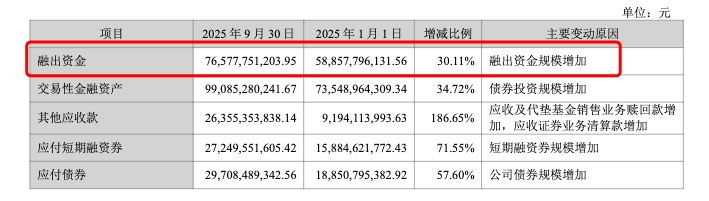 融资融券业务表现强劲。前三季度利息净收入为24.05亿元,同比增长59.71%,财报指出业绩增长主要源于“融出资金利息收入增加”。截至报告期末,公司“融出资金”规模达765.78亿元,较年初增长30.11%。