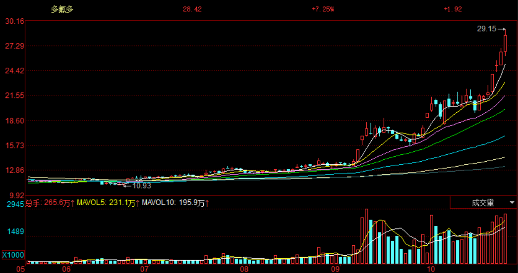 $多氟多(SZ002407)$:六氟磷酸锂+固态电池+储能。公司的一个突出亮点是六氟磷酸锂价格持续上涨,从10月初的6万元/吨涨至近期10.6万元/吨左右,公司年产能约6.5万吨,产品涨价有望显著改善盈利。今天该股表现强势,盘中触及涨停,市场活跃度和资金热度都非常高,推动上涨的主要逻辑是六氟磷酸锂供需紧张,价格快速上涨,以及公司在固态电池材料方面的技术积淀,产品涨价趋势和储能需求爆发为公司提供了短期强劲的驱动力,股价处于主升浪中,继续持股。