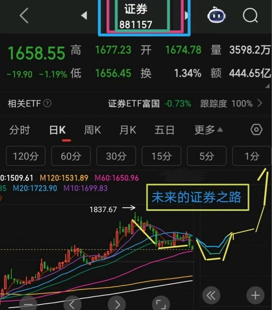 而接下来两个月行情里,我唯一的延续判断就是互联网券商个股放弃抵抗,从指南针先破位开始,接着是剩下的几只,最后到东财,完成这一些列K线运行,成交量也放出来了,散户筹码也交换了,机构也完成传统券商的调仓了,那时候GJD队就会选择同步拉升大金融的证券板块了。