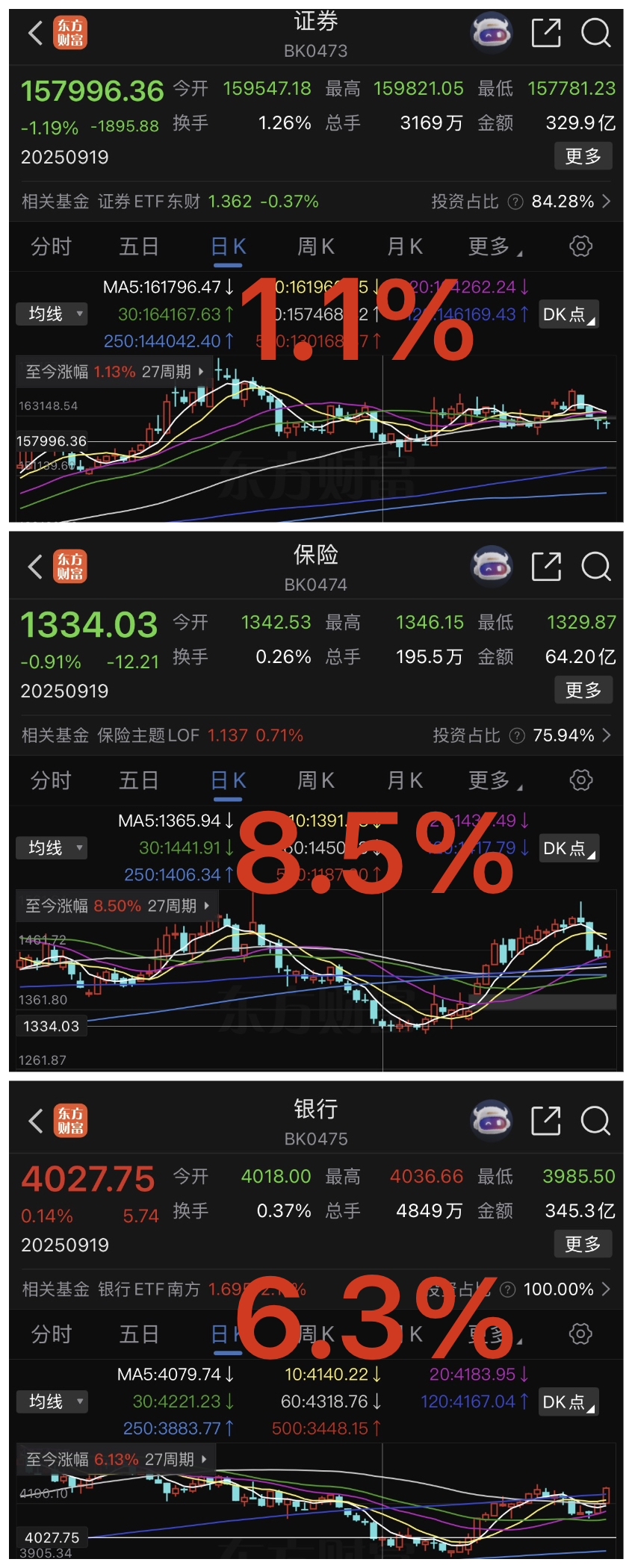 证券1.1%,银行6.3%,保险8.8%,证券是大金融三大板块里最弱的,究其原因还是维持我之前的判断,要等待互联网金融放弃抵抗,资金回流到各个传统券商,机构完成调仓这样证券板块才会同步走好走好。