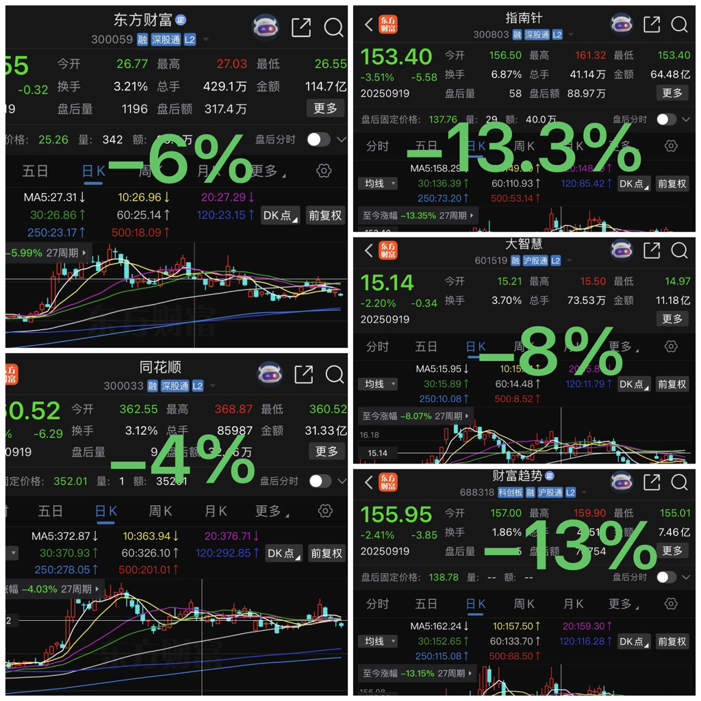 东财-6%,同花顺-4%,指南针-13.3%,大智慧-8%,财富趋势-13%,可以看到相对有业绩支撑的东财和同花顺跌幅最小,但与证券板块对比也出现了明显的剪刀差背离走势,无论是业绩还是走势?什么原因?