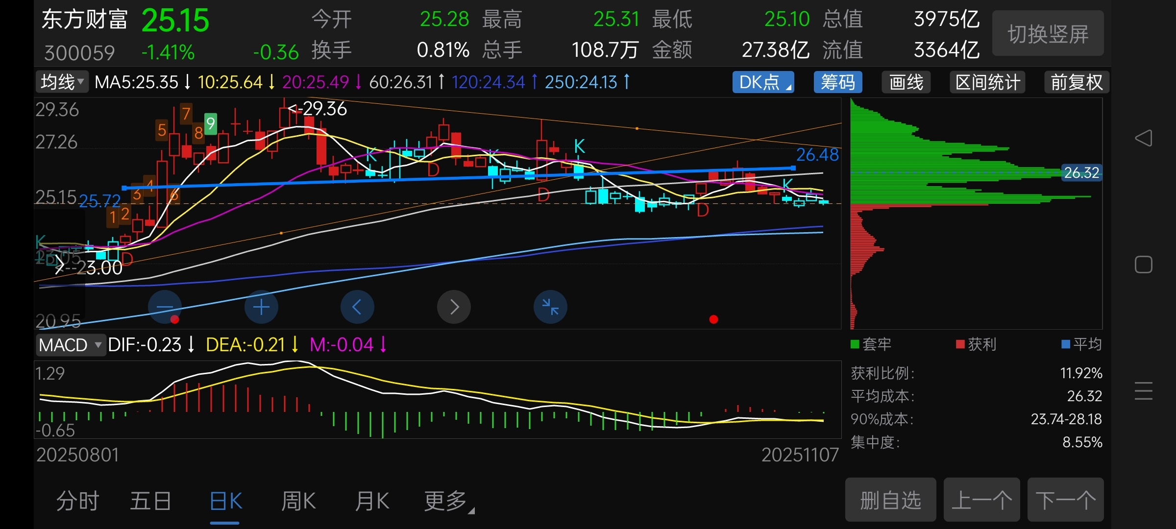 中间的一根蓝线是分界线颈线。上部区域是套牢筹码,大概是两个月区间。如果要化解全部套牢筹码,要么是空间到位,要么是时间到位。 空间到位,大概要跌到23.x附近。估计日中会跌破250日均线。时间到位,也要在颈线下部盘整两个月,估计在12月10号以后,也就是12月中旬开始,进入上升趋势。