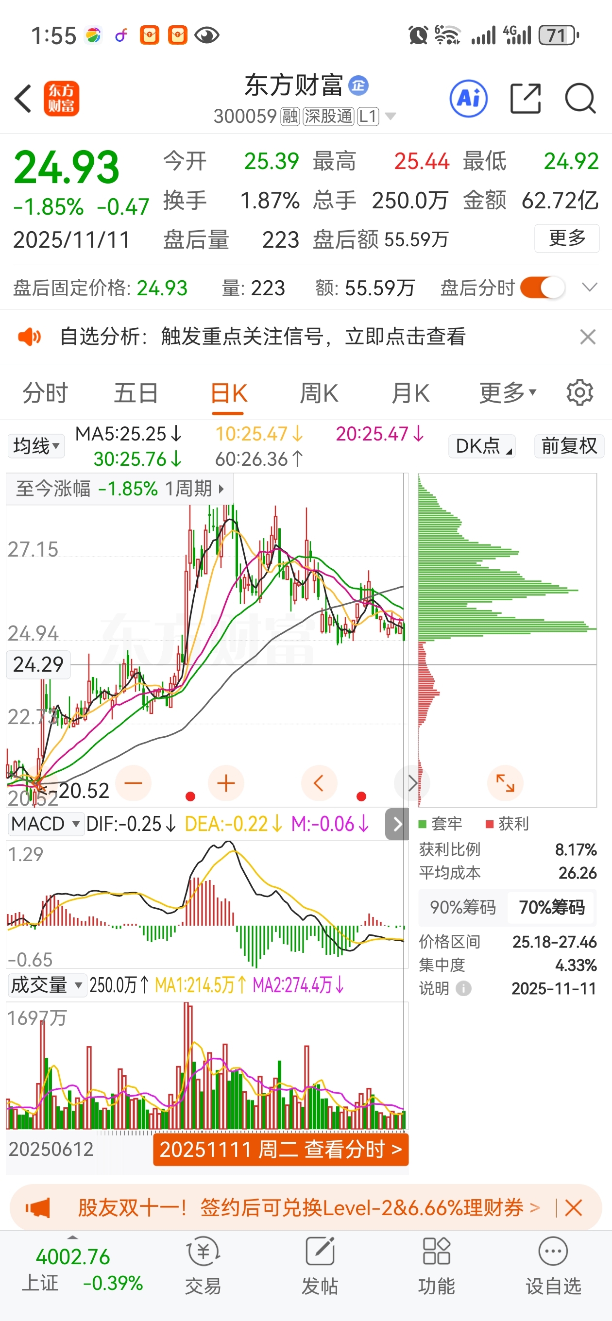 $东方财富(SZ300059)$ 24.8-24.68-24.3支撑位,没有增量资金,波段目标20