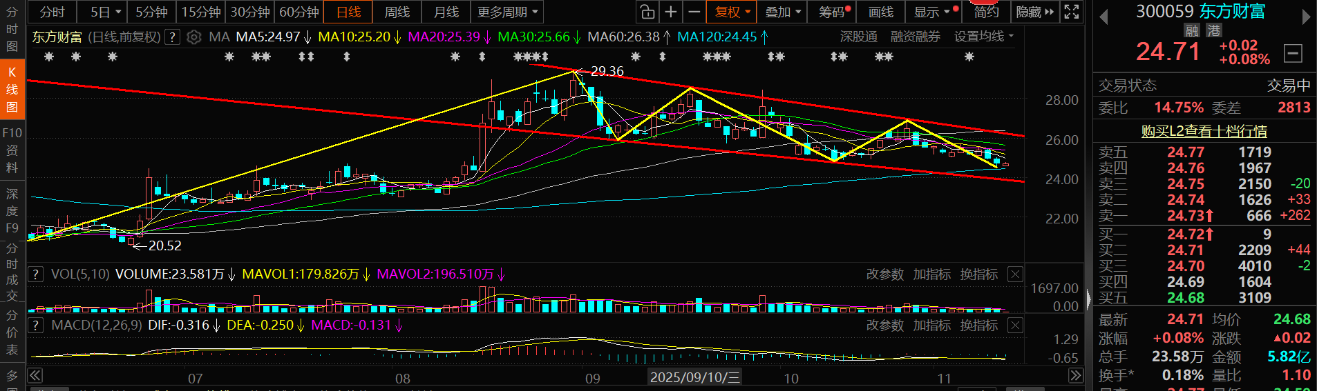 东财最近一直在下行通道里,看则样子会跌到24左右才能再起来