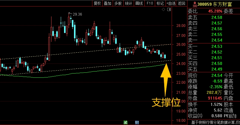 $东方财富(SZ300059)$ 近短时间逐步有弱,不是很好看,短线这里继续回落的话重点看脚底趋势线和大均线附近的支撑,大概23.95-24.29附近,能稳住就还行,稳不住就难看了,但稳住不代表就放心了,还需要站稳头顶安全线25.56以上才行,不能着急,慢慢观察。